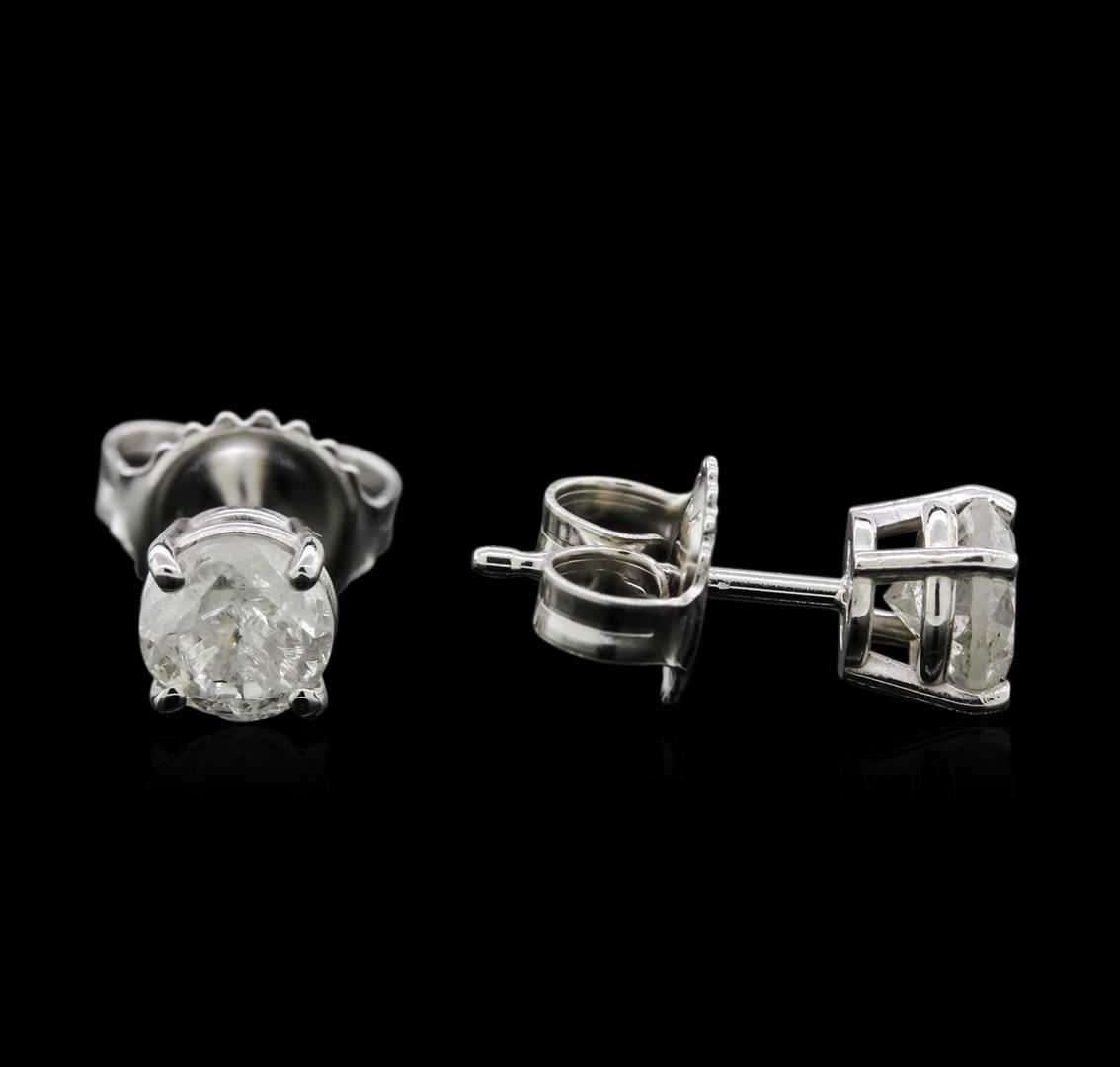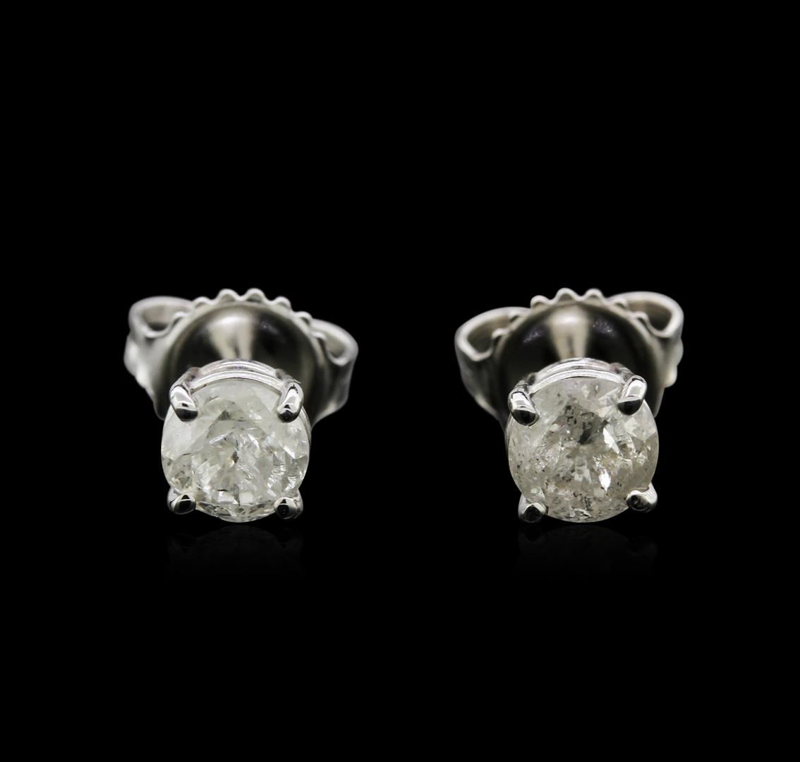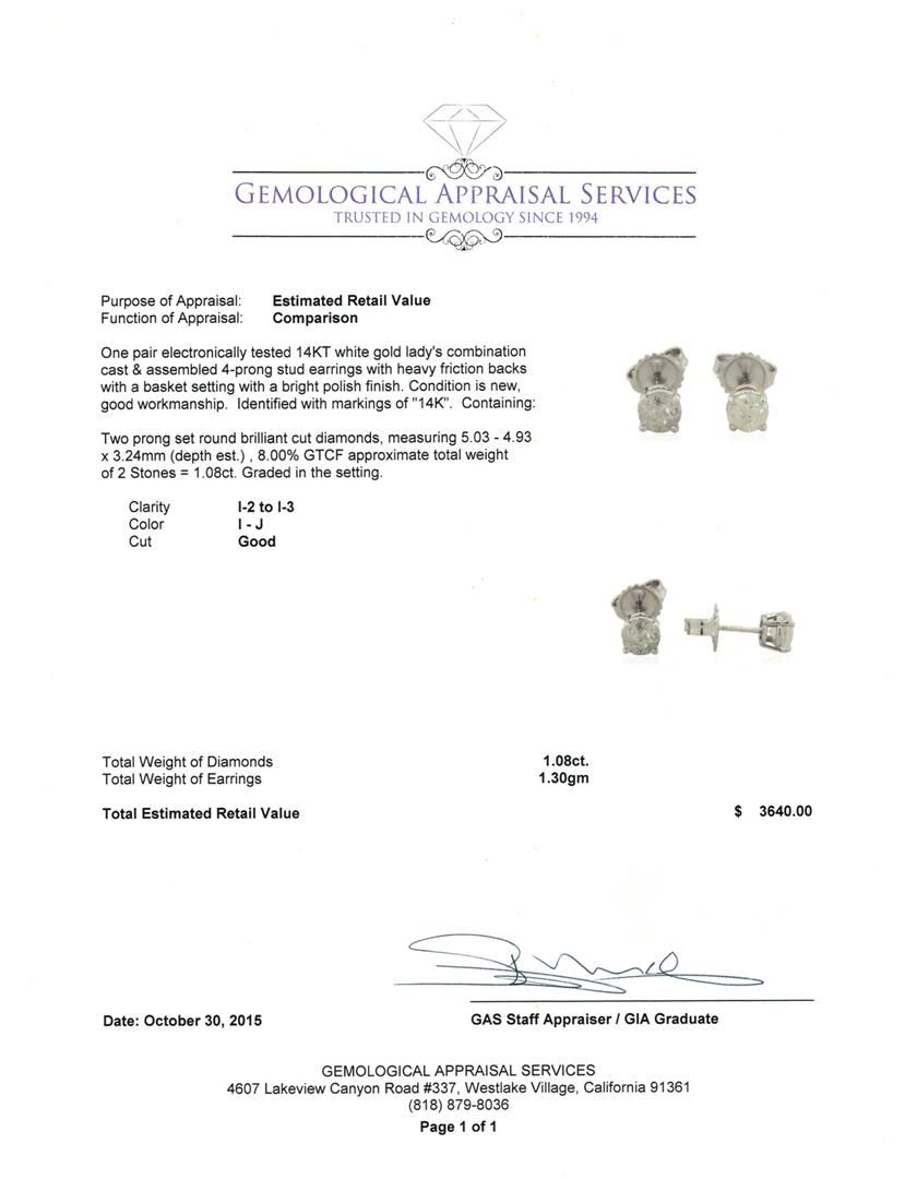 One pair electronically tested 14KT white gold lady's combination cast & assembled 4-prong stud earrings with heavy friction backs with a basket setting with a bright polish finish. Identified with markings of "14K". Condition is new, good workmanship. Containing: Two prong set round brilliant cut diamonds, measuring 5.03 - 4.93 x 3.24mm (depth est.) , 8.00% GTCF approximate total weight of 2 Stones = 1.08ct. Graded in the setting. Clarity: I-2 to I-3. Color: I - Good. Total Weight of Diamonds 1.08ct. Total Weight of Earrings 1.30gm. GAS Appraised.