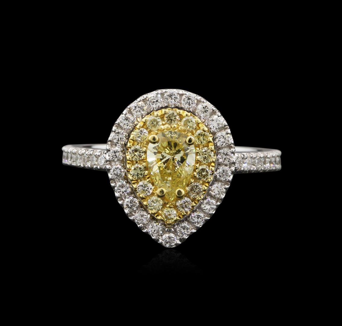 One ring featuring: 14KT white gold weighing 4.34 grams containing one prong set pear shape fancy yellow diamond center stone with a total weight of 0.47ct, prong set round white diamonds with a total weight of 0.43ct and prong set round yellow diamonds with a total weight of 0.18ct.