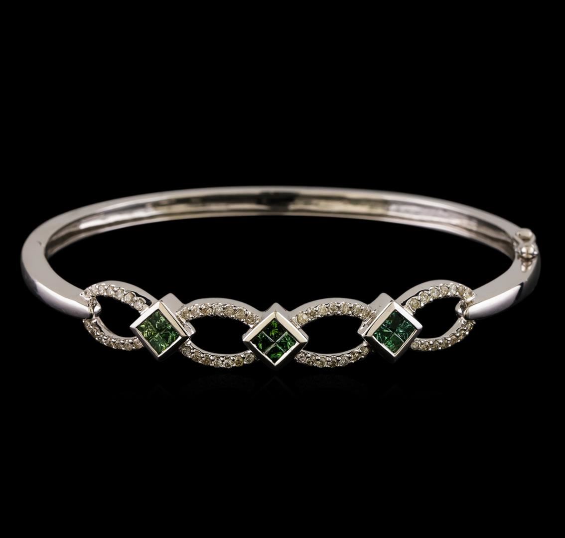 One electronically tested 14KT white gold ladies cast & assembled diamond bangle bracelet. Six and one-half inch wearable length bangle bracelet features a series of three green diamond stations set between diamond ribbon ovals. The bracelet tapers from eight millimeters to three millimeters wide, supported by hinged shoulders, terminating in a concealed clasp with twin safeties. Bright polish finish. Identified with markings of '14K'. Condition is good. Containing: Twelve invisible set princess cut diamonds, measuring 2.10 x 2.00 x 1.50mm (depth est.) approximate total weight of 12 Stones = 0.64ct. Indications of laboratory irradiated enhanced color. Graded in the setting. Clarity SI-2 to I-2 Fifty-Six prong set round brilliant cut diamonds, measuring 1.30 - 1.20 x 0.75mm (depth est.) approximate total weight of 56 Stones = 0.45ct. Graded in the setting. Clarity I-1 to I-2. Color: G - I. Total Weight of Diamonds 1.09ct.. Total Weight of Bracelet 13.27gm. AIG Appraised at $4,375.00.