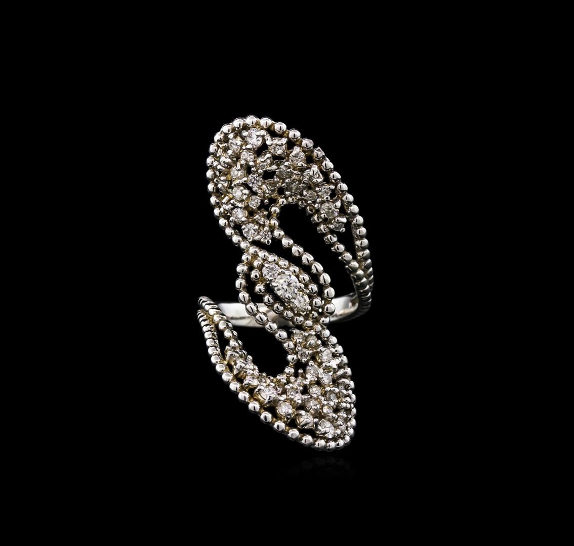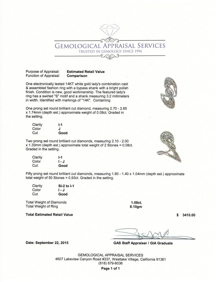 One electronically tested 14KT white gold lady's combination cast & assembled fashion ring with a bypass shank with a bright polish finish. The featured lady's ring has a swirled "S" motif and a shank measuring 3.2 millimeters in width. Identified with markings of "14K". Condition is new, good workmanship. Containing: One prong set round brilliant cut diamond, measuring 2.70 - 2.65 x 1.74mm (depth est.) approximate weight of 0.08ct. Graded in the setting. Clarity: I-1. Color: Good Two prong set round brilliant cut diamonds, measuring 2.10 - 2.00 x 1.33mm (depth est.) approximate total weight of 2 Stones = 0.08ct. Graded in the setting. Clarity: I-1. Color: I - Good Fifty prong set round brilliant cut diamonds, measuring 1.80 - 1.40 x 1.04mm (depth est.) approximate total weight of 50 Stones = 0.93ct. Graded in the setting. Clarity: SI-2 to I-1. Color: I - Good. Total Weight of Diamonds 1.09ct. Total Weight of Ring 8.10gm at $3410.00.. GAS Appraised at $3,410.00.