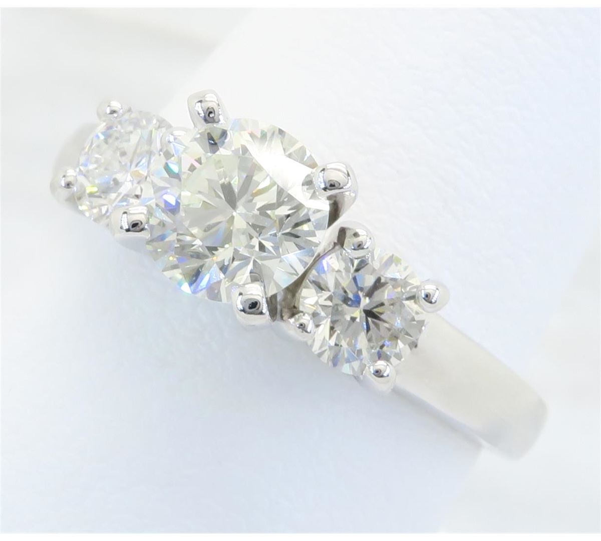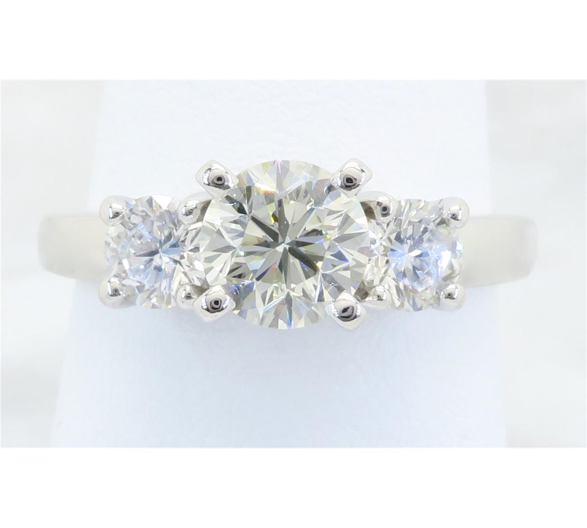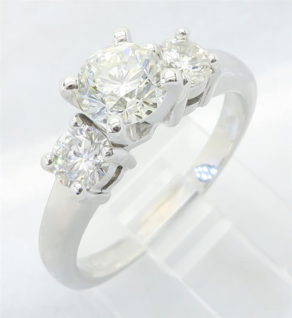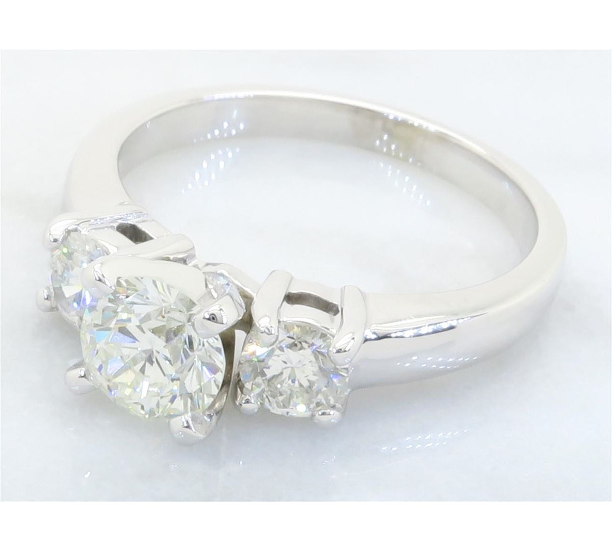 One tested 14K white gold diamond ring. Containing: One Round Brilliant Cut Diamond. Approximate Size: .65CT, Clarity: SI1, Color: J-K. Two Round Brilliant Cut Diamonds. Approximate total diamond weight: 1.09CTW. All diamonds are graded in the mounting unless otherwise stated. Weight of ring: 4.0 grams, Size: 6.25.
