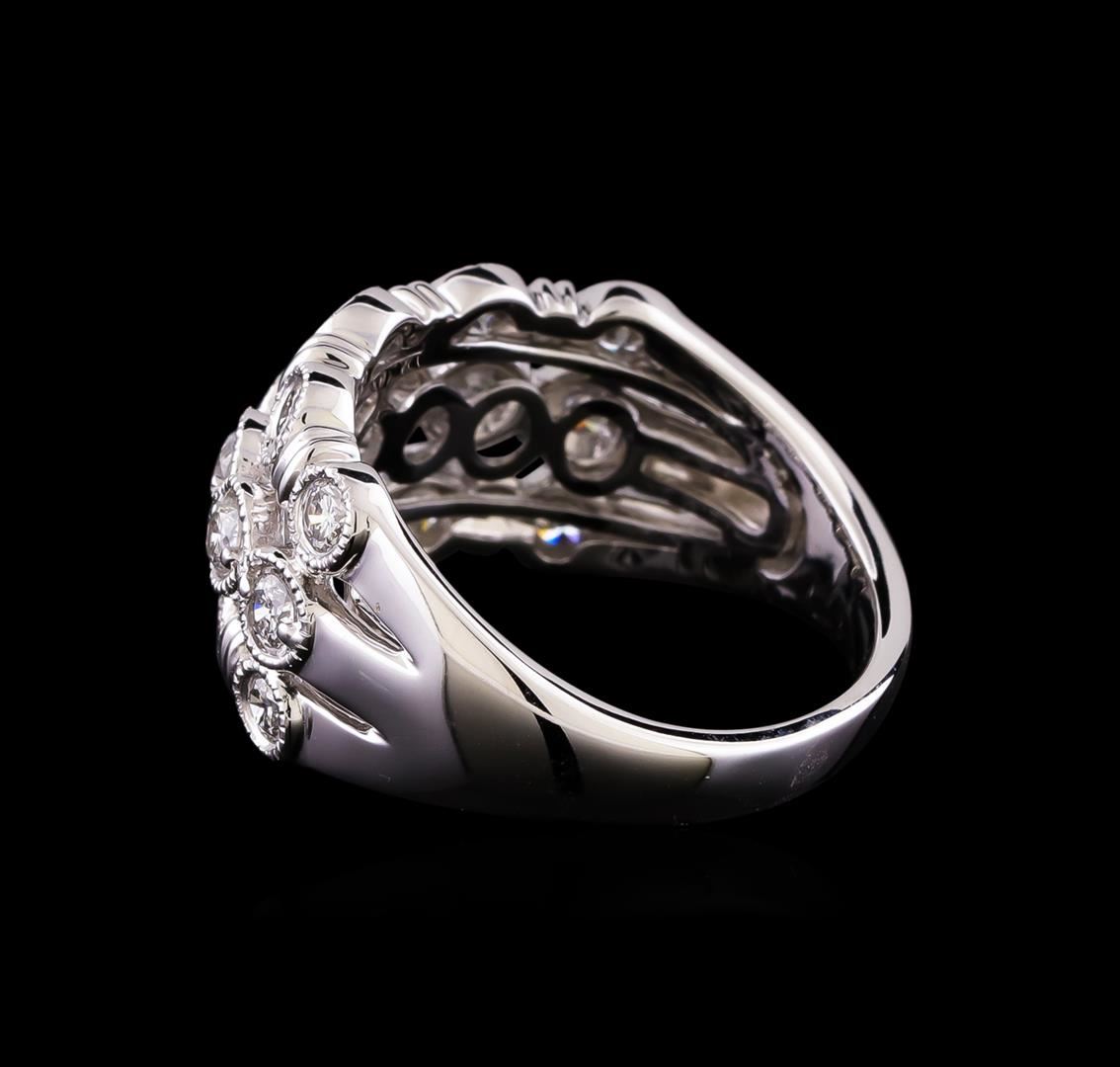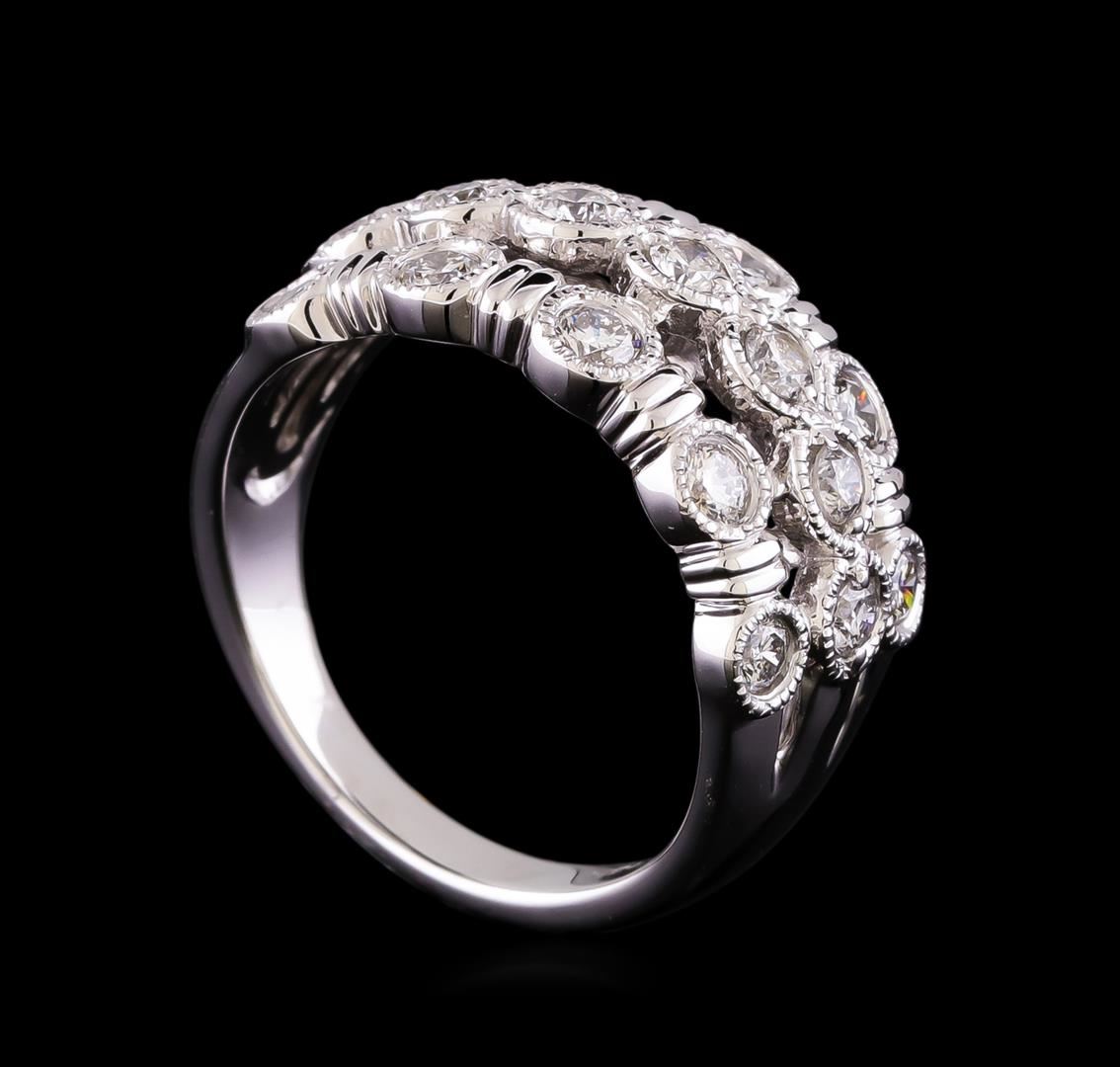 One electronically tested 14KT white gold lady's cast fashion ring with a three row wide band with a bright polish with milgrain detailing finish. The featured lady's ring has a shank measuring 2.99 millimeters in width. Identified with markings of '14K'. Condition is new, good workmanship. Containing: Seven prong set round brilliant cut diamonds, measuring 2.70 - 2.65 x 1.66mm (depth est.) approximate total weight of 7 Stones = 0.51ct. Graded in the setting. Clarity SI-1 to SI-2. Color: H - I Cut Very Good Ten bezel set round brilliant cut diamonds, measuring 2.50 - 2.45 x 1.54mm (depth est.) approximate total weight of 10 Stones = 0.58ct. Graded in the setting. Clarity VS-2 to SI-2. Color: H - I Cut Very Good. Total Weight of Diamonds 1.09ct.. Total Weight of Ring 6.90gm. GAS Appraised at $4,000.00.