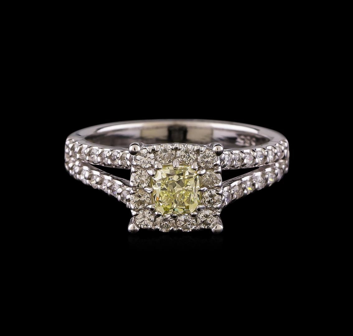 One electronically tested 14KT white gold lady's cast wedding ring with a split shank halo with a bright polish finish. The featured lady's ring has a shank measuring 2.47 millimeters wide. Identified with markings of '585'. Condition is new, good workmanship. Containing: One prong set cushion cut diamond, measuring 4.50 x 4.45 x 3.00mm (depth est.) approximate weight of 0.51ct. Graded in the setting. Clarity VS-1 Cut Very Good Twelve prong set round brilliant cut diamonds, measuring 1.85 - 1.75 x 1.10mm (depth est.) approximate total weight of 12 Stones = 0.26ct. Graded in the setting. Clarity SI-1 to SI-2. Color: H - I Cut Good Thirty-Two prong set round brilliant cut diamonds, measuring 1.40 - 1.35 x 0.86mm (depth est.) approximate total weight of 32 Stones = 0.32ct. Graded in the setting. Clarity SI-1 to I-1. Color: H - I Cut Good. Total Weight of Diamonds 1.09ct.. Total Weight of Ring 4.00gm. GAS Appraised at $6,755.00.