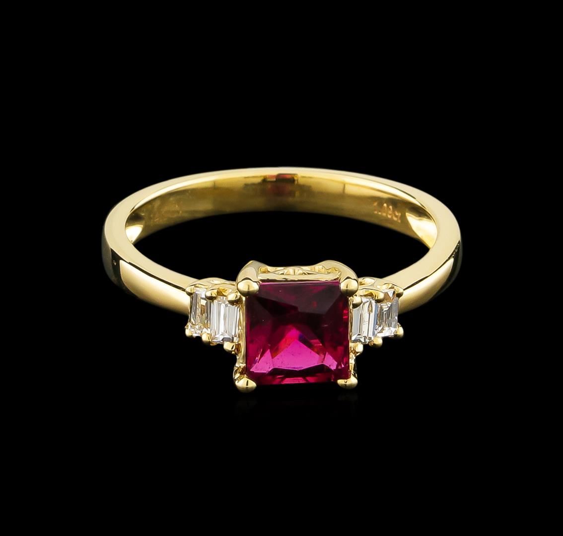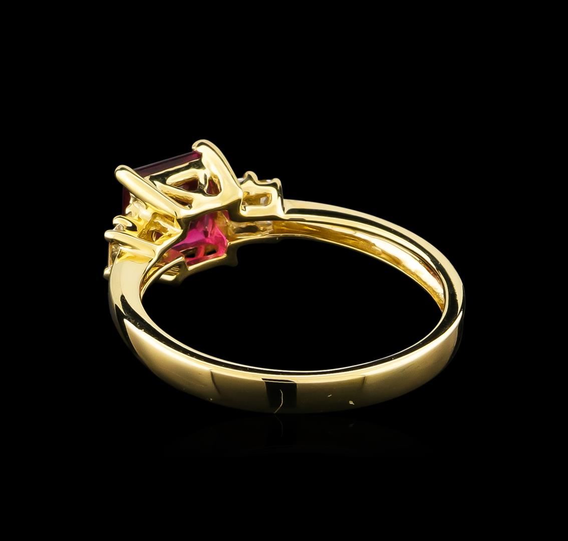 One electronically tested 14KT yellow gold ladies cast pink tourmaline and diamond ring with a bright polish finish. The featured pink tourmaline is supported by diamond accented shoulders, completed by a two and one-half millimeter wide band. Trademark is CJ. Identified with markings of "14K". Condition is new, good workmanship. Containing: One prong set princess brilliant cut natural pink tourmaline, measuring 5.85 x 5.70 x 4.00mm, approximate weight of 1.09ct., clarity is moderately included, type II, medium, moderately strong, slightly purplish red color, (GIA slpR 5/4), cut is good. Transmitting light somewhat diffusely, transparent to translucent. Naturally occurring internal & external characteristics are present. Graded in the setting. This color of tourmaline is commonly irradiated to improve or change the color. Whether or not this gemstone has been irradiated cannot currently be determined. Four prong set baguette cut diamonds, measuring from 2.70 x 1.60 x 1.12mm (depth est.) to 2.80 x 1.60 x 1.12mm (depth est.) approximate total weight of 4 Stones = 0.18ct. Graded in the setting. Clarity: VS-2 to SI-1. Color: G - H. Total Weight of Colored Stones 1.09ct. Total Weight of Diamonds 0.18ct. Total Weight of Ring 2.79gm. AIG Appraised at $1,360.00.