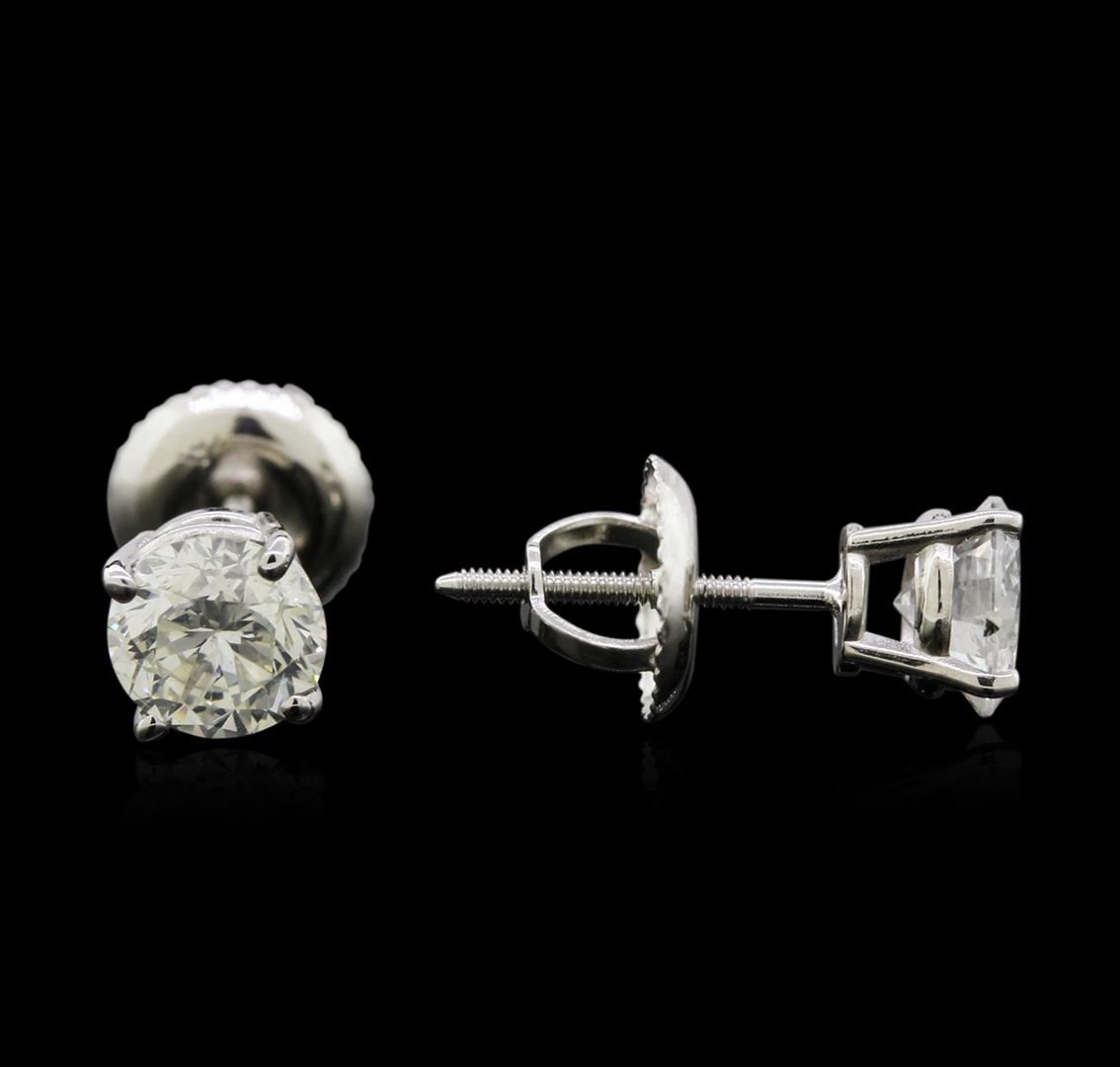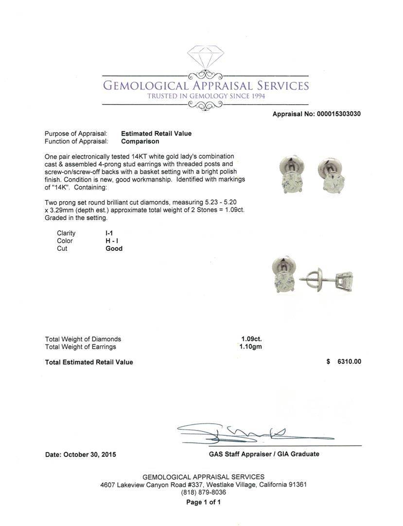 One pair electronically tested 14KT white gold lady's combination cast & assembled 4-prong stud earrings with threaded posts and screw-on/screw-off backs with a basket setting with a bright polish finish. Identified with markings of "14K". Condition is new, good workmanship. Containing: Two prong set round brilliant cut diamonds, measuring 5.23 - 5.20 x 3.29mm (depth est.) approximate total weight of 2 Stones = 1.09ct. Graded in the setting. Clarity: I-1. Color: H - I. Cut Good. Total Weight of Diamonds 1.09ct. Total Weight of Earrings 1.10gm. GAS Appraised.