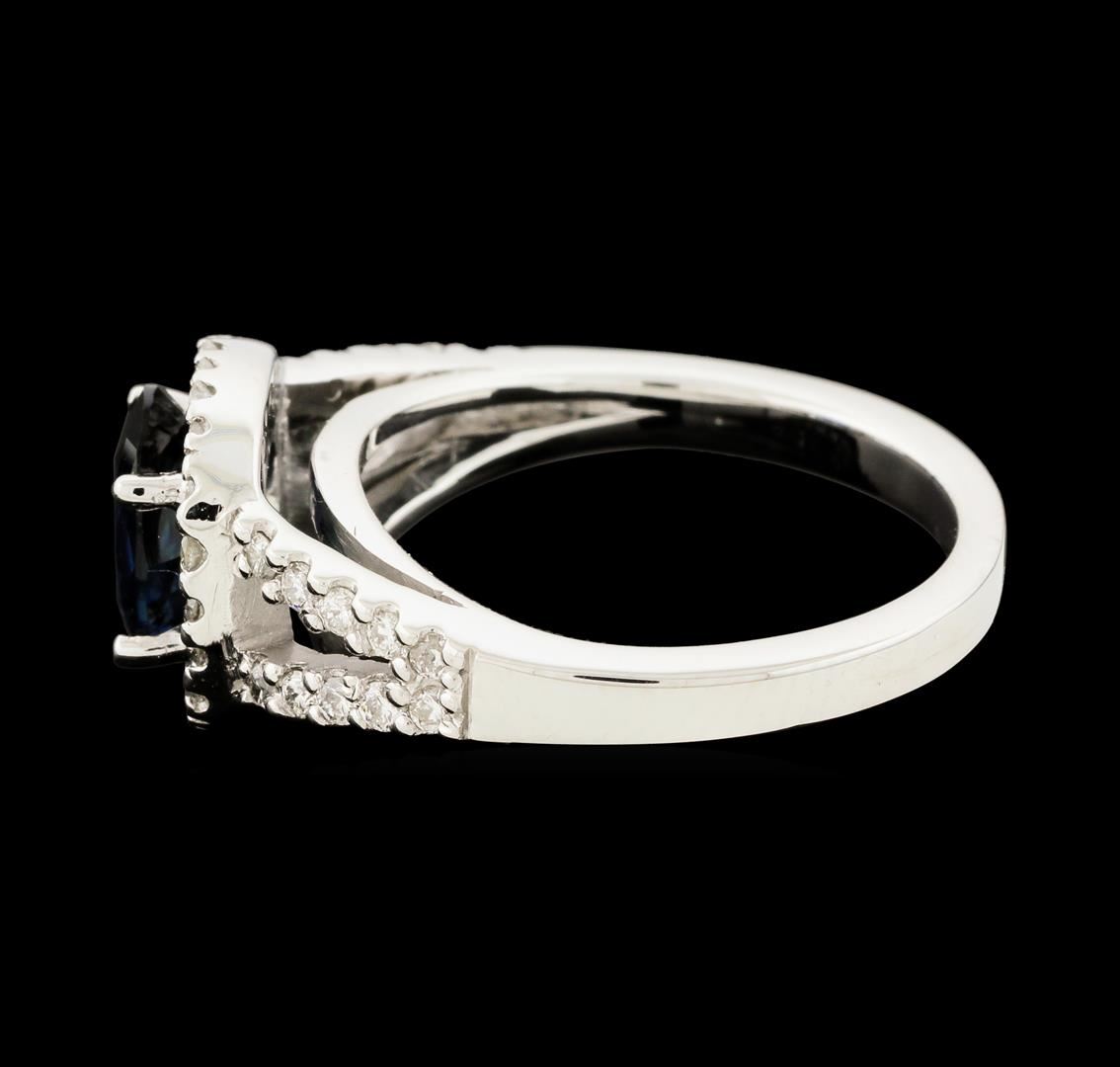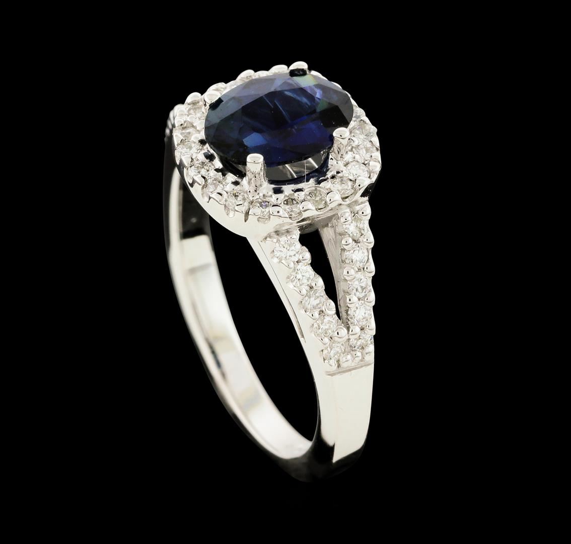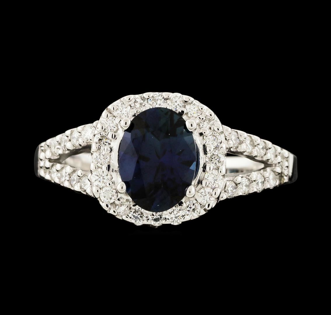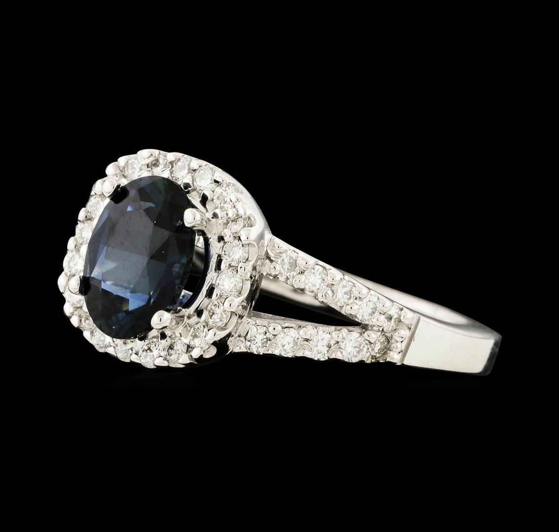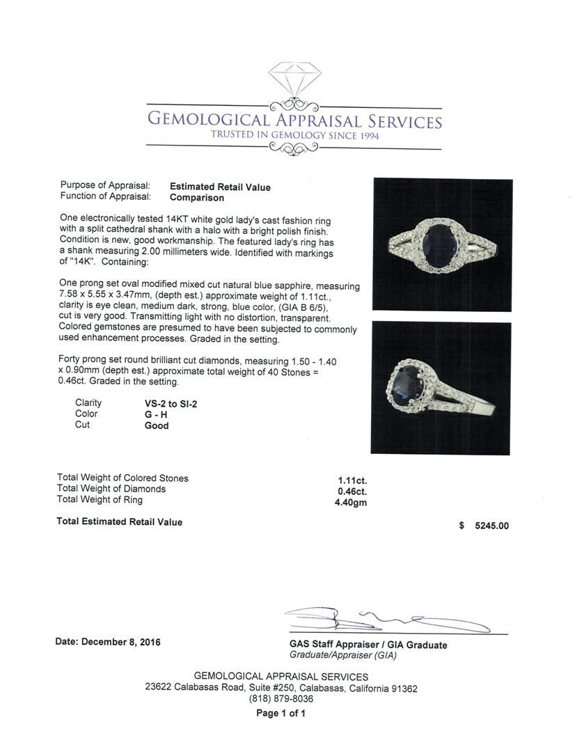 One electronically tested 14KT white gold lady's cast fashion ring with a split cathedral shank with a halo with a bright polish finish. The featured lady's ring has a shank measuring 2.00 millimeters wide. Identified with markings of '14K'. Condition is new, good workmanship. Containing: One prong set oval modified mixed cut natural blue sapphire, measuring 7.58 x 5.55 x 3.47mm, (depth est.) approximate weight of 1.11ct., clarity is eye clean, medium dark, strong, blue color, (GIA B 6/5), cut is very good. Transmitting light with no distortion, transparent. Colored gemstones are presumed to have been subjected to commonly used enhancement processes. Graded in the setting. Forty prong set round brilliant cut diamonds, measuring 1.50 - 1.40 x 0.90mm (depth est.) approximate total weight of 40 Stones = 0.46ct. Graded in the setting. Clarity VS-2 to SI-2. Color: G - H Cut Good. Total Weight of Colored Stones 1.11ct.. Total Weight of Diamonds 0.46ct.. Total Weight of Ring 4.40gm. GAS Appraised at $5,245.00.