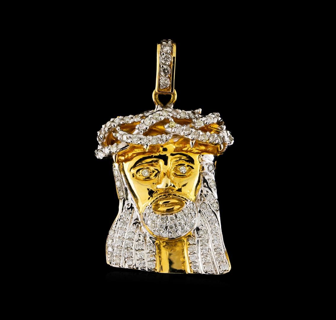 One electronically tested 10KT yellow gold cast & assembled diamond "Jesus" pendant. The pendant features the head of Jesus. Diamonds accent the crown of thorns, his hair, his beard and his eyes. The pendant is completed by a diamond set bail. Bright polish finish with rhodium accents. Area measurements with bail 1.50 x 1.00 inch. Condition is good. Containing: Five prong set round brilliant cut diamonds, measuring 1.90 - 1.90 x 1.14mm (depth est.) approximate total weight of 5 Stones = 0.14ct. Graded in the setting. Clarity: I-1 to I-2. Color: H - I One Hundred Ten prong set round brilliant cut diamonds, measuring 1.40 - 1.20 x 0.78mm (depth est.) approximate total weight of 110 Stones = 0.96ct. The color grade reflects the entire range of color for this group. Graded in the setting. Clarity: I-1 to I-2. Color: H - K. Total Weight of Diamonds 1.10ct. Total Weight of Pendant 14.40gm. AIG Appraised at $4,435.00.
