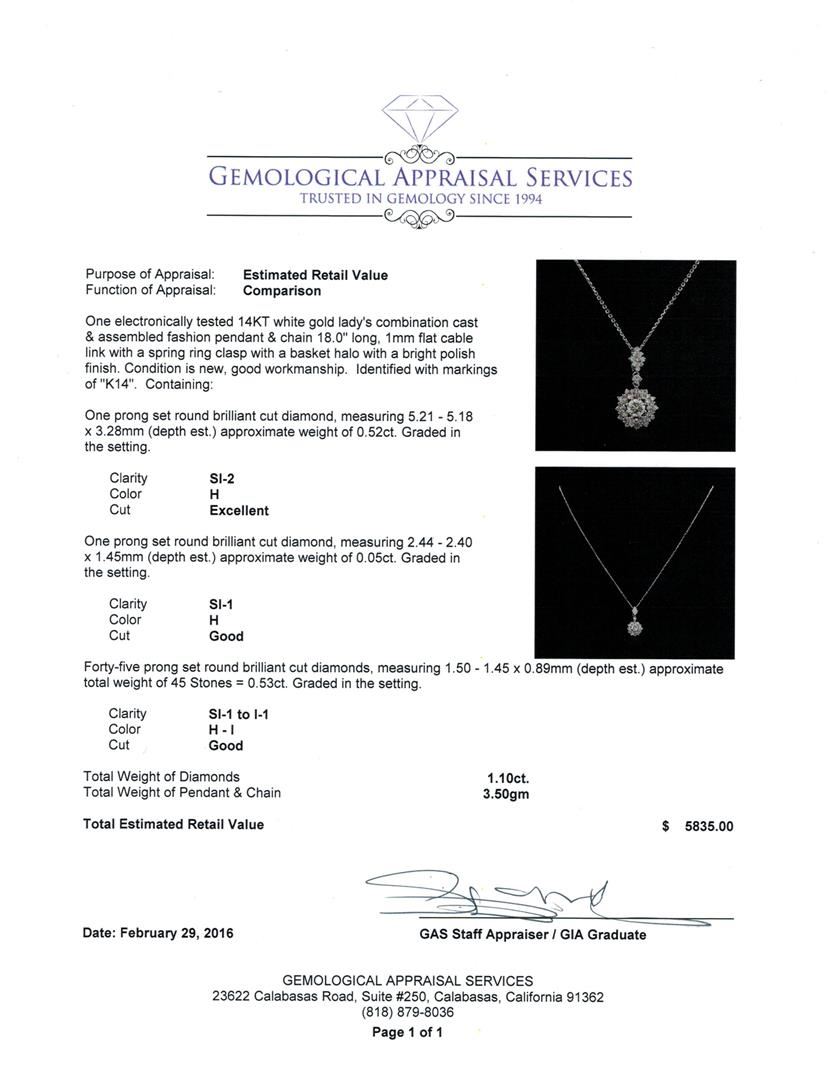 One electronically tested 14KT white gold lady's combination cast & assembled fashion pendant & chain 18.0" long, 1mm flat cable link with a spring ring clasp with a basket halo with a bright polish finish. Identified with markings of "K14". Condition is new, good workmanship. Containing: One prong set round brilliant cut diamond, measuring 5.21 - 5.18 x 3.28mm (depth est.) approximate weight of 0.52ct. Graded in the setting. Clarity: SI-2. Color: H. Cut Excellent One prong set round brilliant cut diamond, measuring 2.44 - 2.40 x 1.45mm (depth est.) approximate weight of 0.05ct. Graded in the setting. Clarity: SI-1. Color: Good Forty-Five prong set round brilliant cut diamonds, measuring 1.50 - 1.45 x 0.89mm (depth est.) approximate total weight of 45 Stones = 0.53ct. Graded in the setting. Clarity: SI-1 to I-1. Color: H - I. Cut Good. Total Weight of Diamonds 1.10ct. Total Weight of Pendant & Chain 3.50gm. GAS Appraised at $5,835.00.