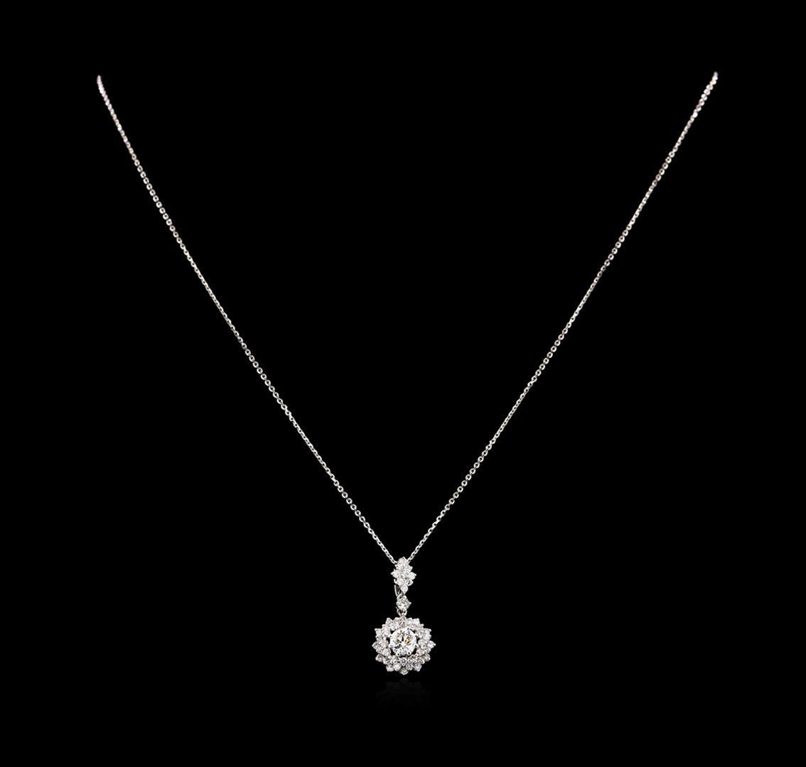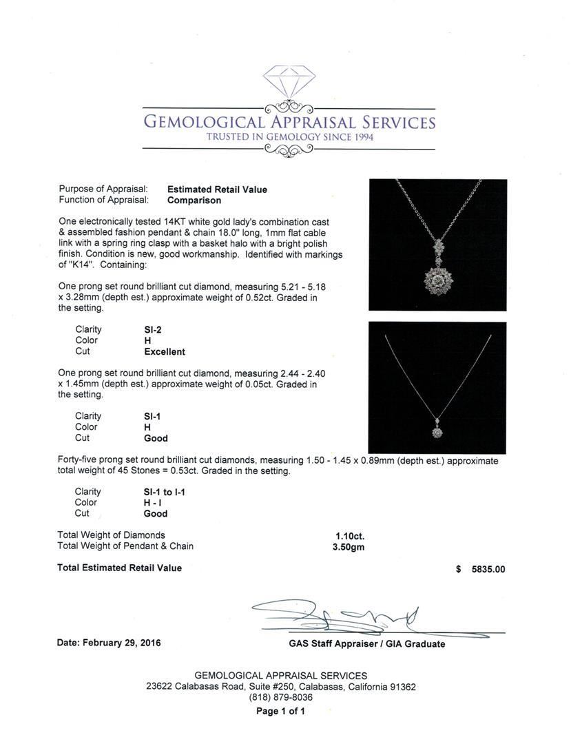 One electronically tested 14KT white gold lady's combination cast & assembled fashion pendant & chain 18.0" long, 1mm flat cable link with a spring ring clasp with a basket halo with a bright polish finish. Identified with markings of "K14". Condition is new, good workmanship. Containing: One prong set round brilliant cut diamond, measuring 5.21 - 5.18 x 3.28mm (depth est.) approximate weight of 0.52ct. Graded in the setting. Clarity: SI-2. Color: H. Cut Excellent One prong set round brilliant cut diamond, measuring 2.44 - 2.40 x 1.45mm (depth est.) approximate weight of 0.05ct. Graded in the setting. Clarity: SI-1. Color: Good Forty-Five prong set round brilliant cut diamonds, measuring 1.50 - 1.45 x 0.89mm (depth est.) approximate total weight of 45 Stones = 0.53ct. Graded in the setting. Clarity: SI-1 to I-1. Color: H - I. Cut Good. Total Weight of Diamonds 1.10ct. Total Weight of Pendant & Chain 3.50gm. GAS Appraised.