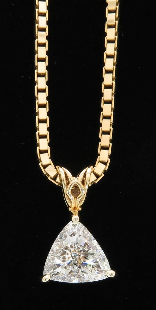 One tested 14K yellow gold diamond pendant. Containing: One Trilliant Cut Diamond. Approximate weight: 1.10CT, Clarity: SI, Color: G-H. Diamonds are graded in the mounting, unless otherwise stated. Weight of necklace: 11.0 grams. Size of chain: 18" long.