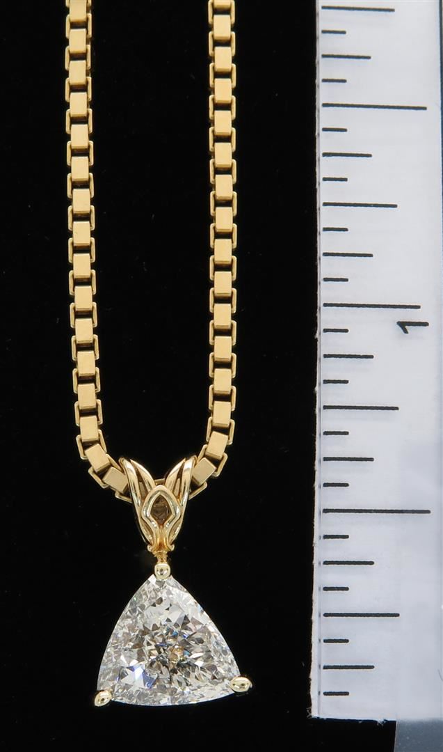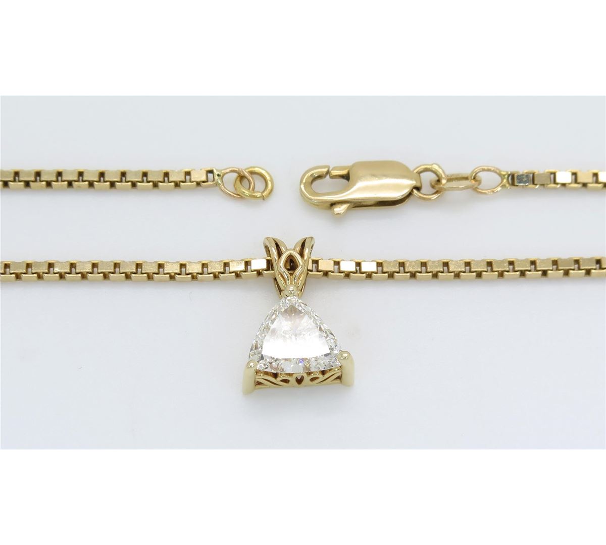 One tested 14K yellow gold diamond pendant. Containing: One Trilliant Cut Diamond. Approximate weight: 1.10CT, Clarity: SI, Color: G-H. Diamonds are graded in the mounting, unless otherwise stated. Weight of necklace: 11.0 grams. Size of chain: 18" long.