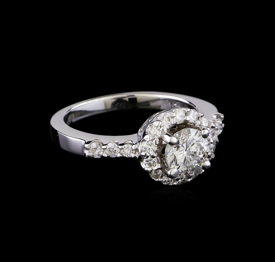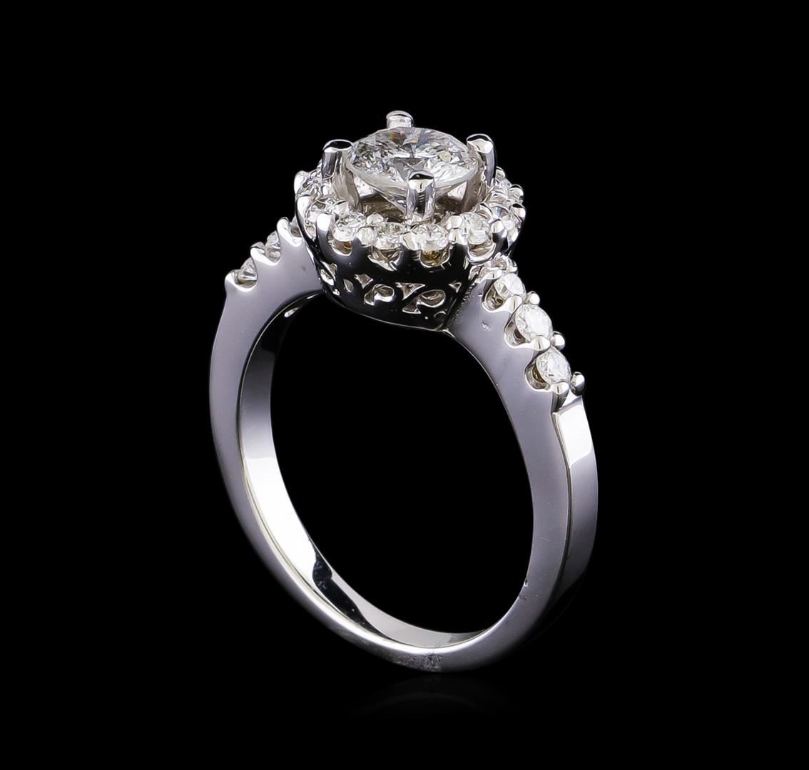 One electronically tested 14KT white gold lady's cast wedding ring with a basket halo with a bright polish finish. The featured lady's ring has a shank measuring 2.26 millimeters in width. Identified with markings of "14K". Condition is new, good workmanship. Containing: One prong set round brilliant cut diamond, measuring 5.80 - 5.71 x 3.51mm (depth est.) approximate weight of 0.70ct. Graded in the setting. Clarity: I-1. Color: Good Fourteen prong set round brilliant cut diamonds, measuring 1.70 - 1.65 x 1.02mm (depth est.) approximate total weight of 14 Stones = 0.25ct. Graded in the setting. Clarity: SI-1 to SI-2. Color: G - I. Cut Good Six prong set round brilliant cut diamonds, measuring 1.90 - 1.80 x 1.15mm (depth est.) approximate total weight of 6 Stones = 0.15ct. Graded in the setting. Clarity: SI-1 to I-1. Color: G - Good. Total Weight of Diamonds 1.10ct. Total Weight of Ring 4.80gm. GAS Appraised at $6,940.00.