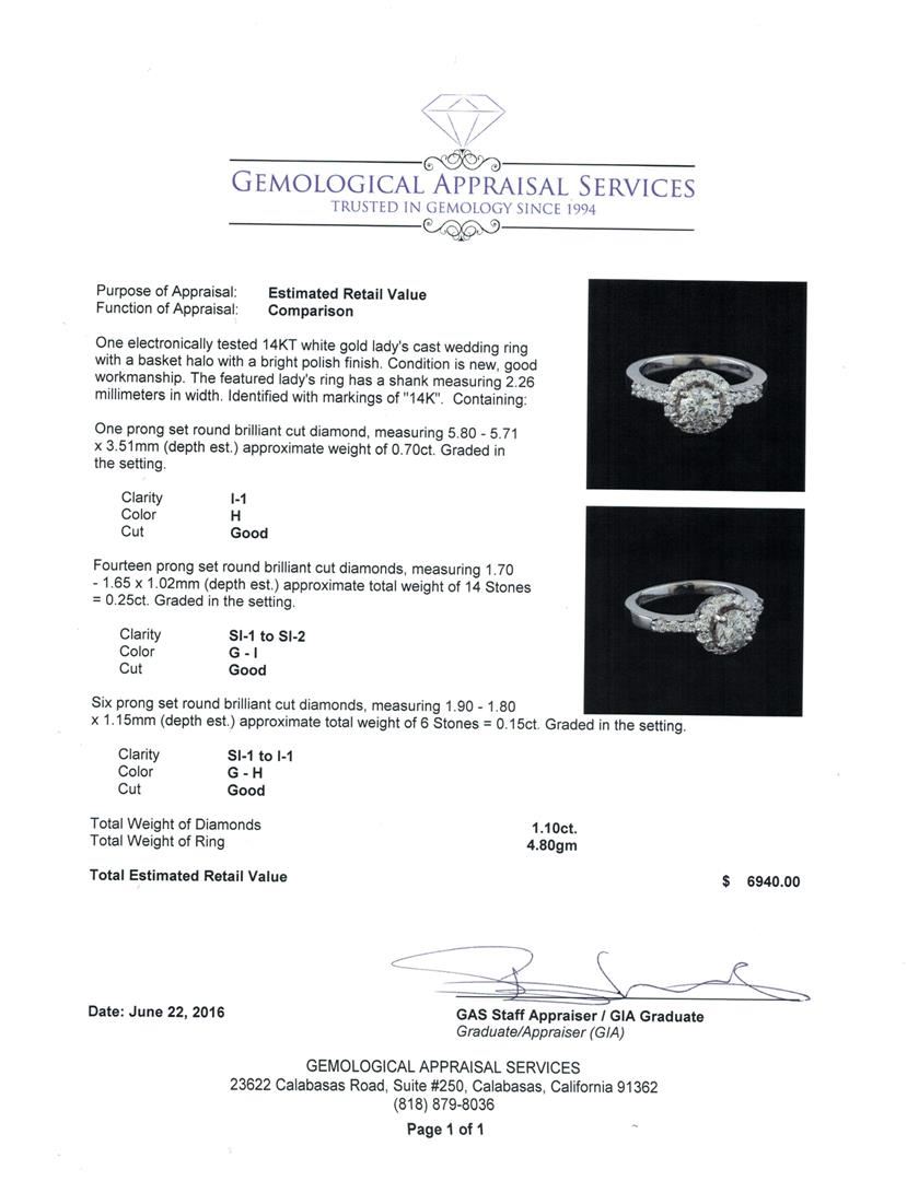 One electronically tested 14KT white gold lady's cast wedding ring with a basket halo with a bright polish finish. The featured lady's ring has a shank measuring 2.26 millimeters in width. Identified with markings of "14K". Condition is new, good workmanship. Containing: One prong set round brilliant cut diamond, measuring 5.80 - 5.71 x 3.51mm (depth est.) approximate weight of 0.70ct. Graded in the setting. Clarity: I-1. Color: Good Fourteen prong set round brilliant cut diamonds, measuring 1.70 - 1.65 x 1.02mm (depth est.) approximate total weight of 14 Stones = 0.25ct. Graded in the setting. Clarity: SI-1 to SI-2. Color: G - I. Cut Good Six prong set round brilliant cut diamonds, measuring 1.90 - 1.80 x 1.15mm (depth est.) approximate total weight of 6 Stones = 0.15ct. Graded in the setting. Clarity: SI-1 to I-1. Color: G - Good. Total Weight of Diamonds 1.10ct. Total Weight of Ring 4.80gm. GAS Appraised at $6,940.00.