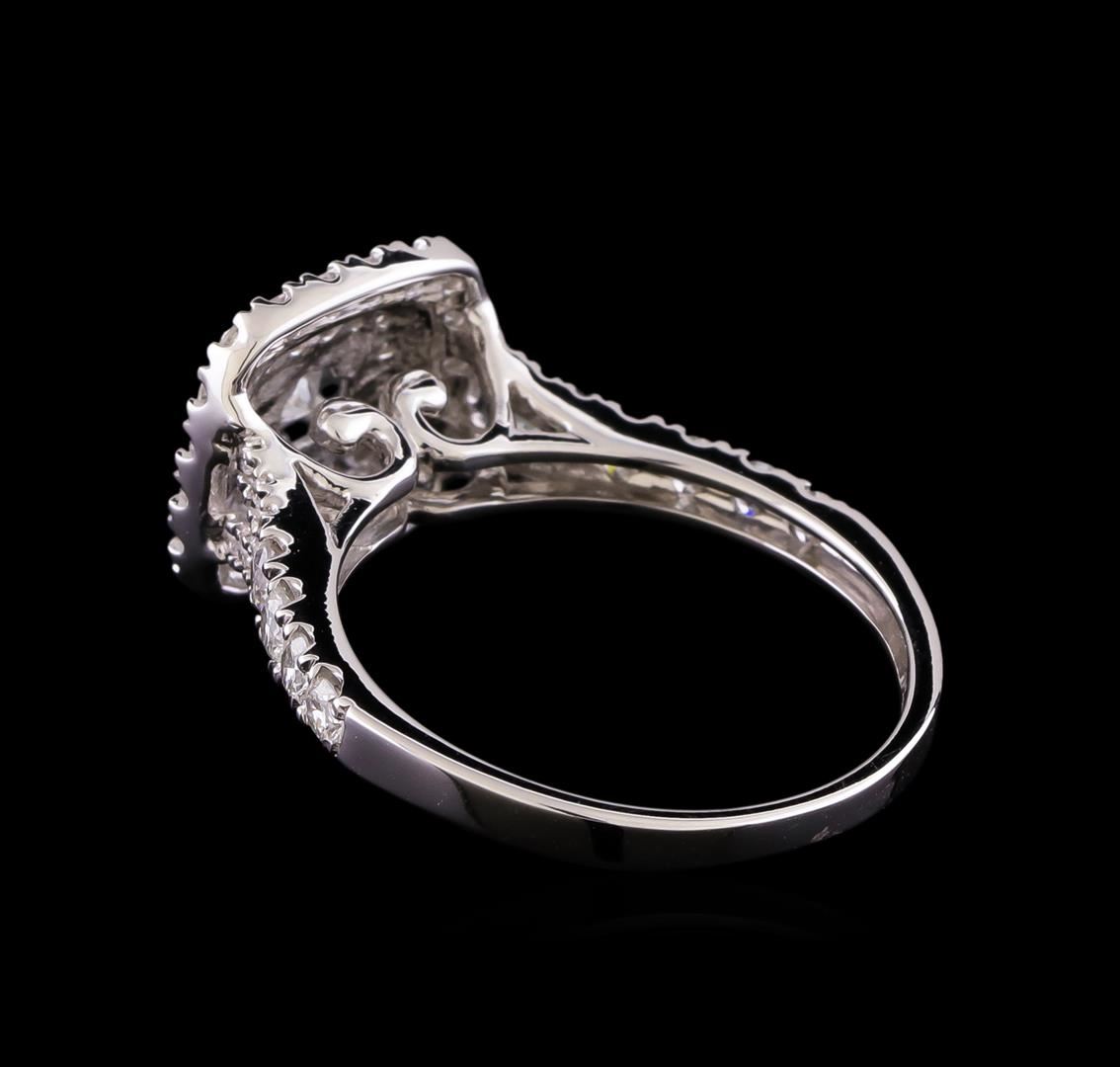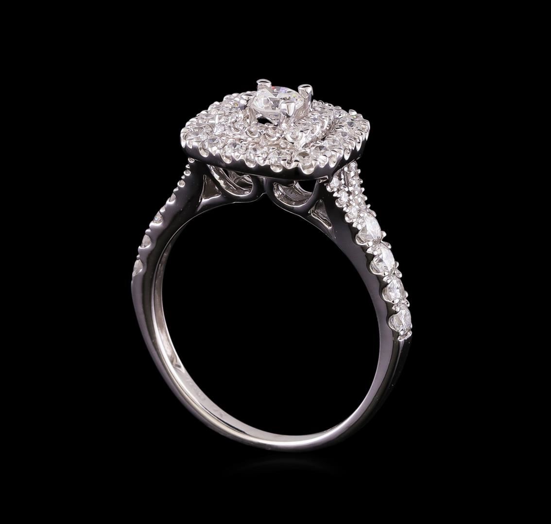 One electronically tested 14KT white gold lady's cast wedding ring with a split shank cathedral halo with a bright polish finish. The featured lady's ring has a shank measuring 1.75 millimeters in width. Identified with markings of '14K'. Condition is new, good workmanship. Containing: One prong set round brilliant cut diamond, measuring 3.67 - 3.66 x 2.28mm (depth est.) approximate weight of 0.19ct. Graded in the setting. Clarity SI-2. Color: I Cut Good Eight prong set round brilliant cut diamonds, measuring 2.60 - 2.35 x 1.54mm (depth est.) approximate total weight of 8 Stones = 0.45ct. Graded in the setting. Clarity SI-1 to SI-2. Color: H - I Cut Good Twenty prong set round brilliant cut diamonds, measuring 1.70 - 1.60 x 1.02mm (depth est.) approximate total weight of 20 Stones = 0.34ct. Graded in the setting. Clarity SI-1 to SI-2. Color: H - I Cut Good Twenty-Eight prong set round brilliant cut diamonds, measuring 1.10 - 1.00 x 0.65mm (depth est.) approximate total weight of 28 Stones = 0.12ct. Graded in the setting. Clarity SI-1 to SI-2. Color: H - I Cut Good. Total Weight of Diamonds 1.10ct.. Total Weight of Ring 3.20gm. GAS Appraised at $2,630.00.