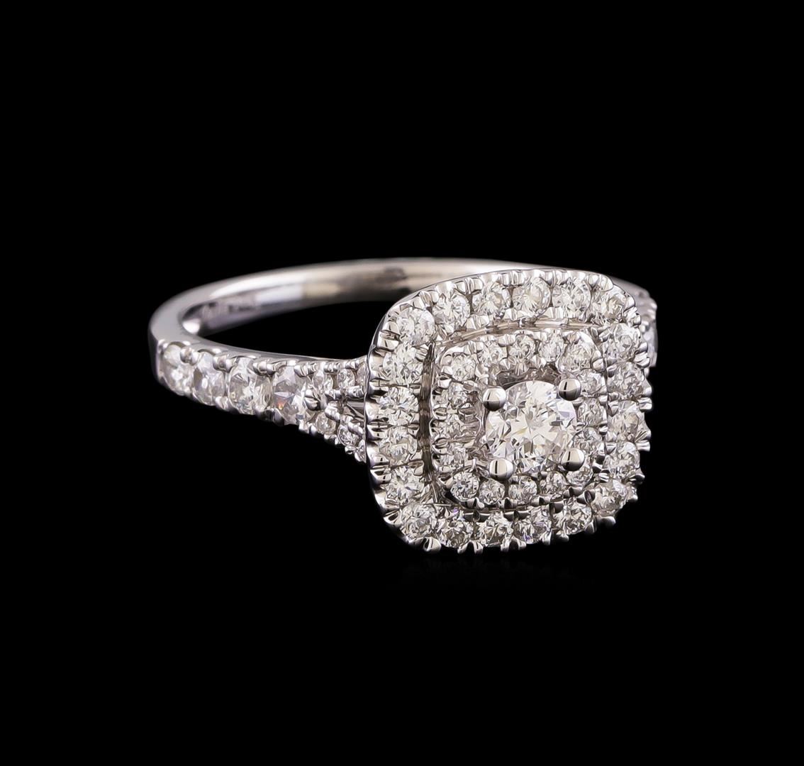 One electronically tested 14KT white gold lady's cast wedding ring with a split shank cathedral halo with a bright polish finish. The featured lady's ring has a shank measuring 1.75 millimeters in width. Identified with markings of '14K'. Condition is new, good workmanship. Containing: One prong set round brilliant cut diamond, measuring 3.67 - 3.66 x 2.28mm (depth est.) approximate weight of 0.19ct. Graded in the setting. Clarity SI-2. Color: I Cut Good Eight prong set round brilliant cut diamonds, measuring 2.60 - 2.35 x 1.54mm (depth est.) approximate total weight of 8 Stones = 0.45ct. Graded in the setting. Clarity SI-1 to SI-2. Color: H - I Cut Good Twenty prong set round brilliant cut diamonds, measuring 1.70 - 1.60 x 1.02mm (depth est.) approximate total weight of 20 Stones = 0.34ct. Graded in the setting. Clarity SI-1 to SI-2. Color: H - I Cut Good Twenty-Eight prong set round brilliant cut diamonds, measuring 1.10 - 1.00 x 0.65mm (depth est.) approximate total weight of 28 Stones = 0.12ct. Graded in the setting. Clarity SI-1 to SI-2. Color: H - I Cut Good. Total Weight of Diamonds 1.10ct.. Total Weight of Ring 3.20gm. GAS Appraised at $2,630.00.