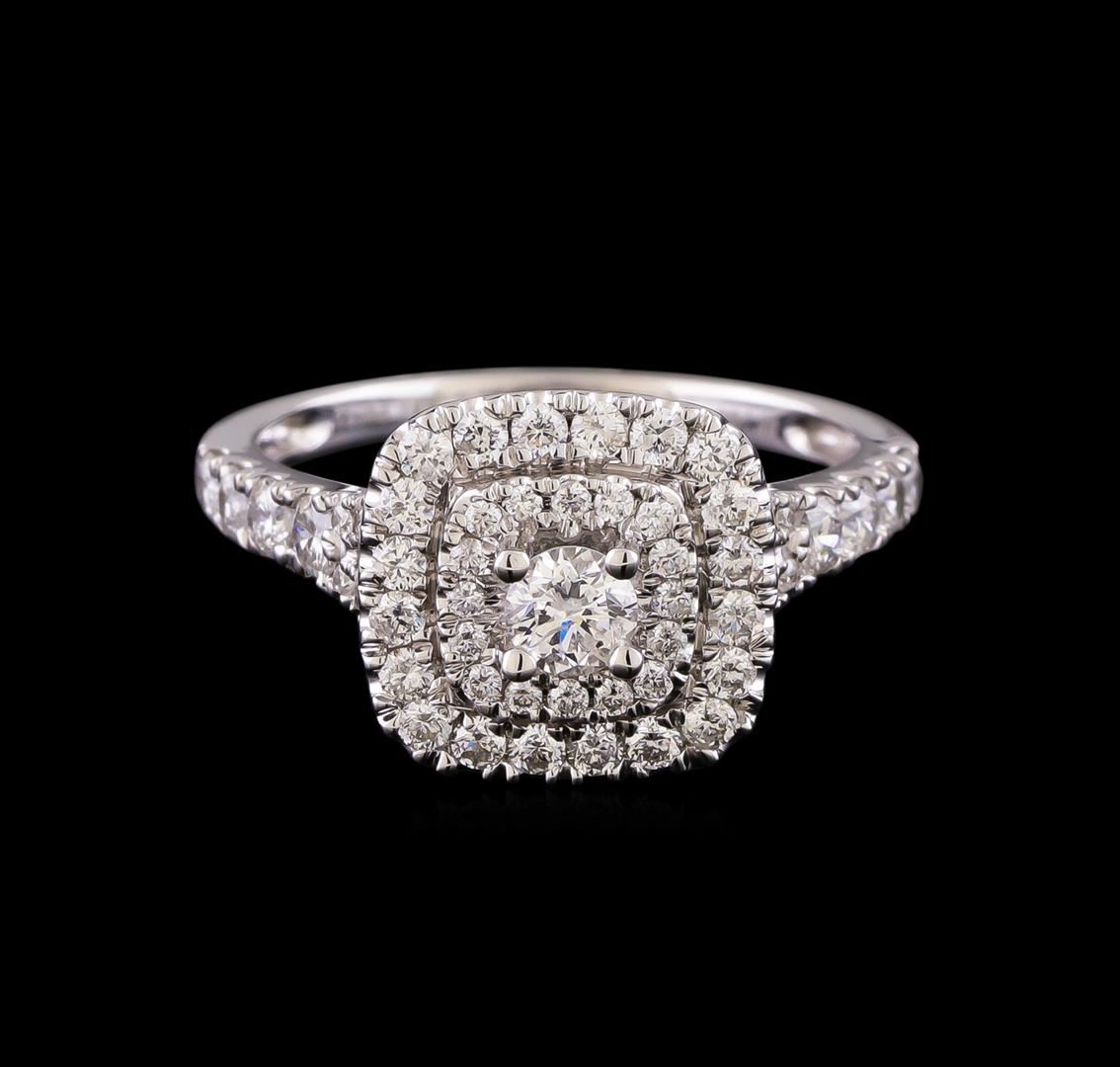 One electronically tested 14KT white gold lady's cast wedding ring with a split shank cathedral halo with a bright polish finish. The featured lady's ring has a shank measuring 1.75 millimeters in width. Identified with markings of '14K'. Condition is new, good workmanship. Containing: One prong set round brilliant cut diamond, measuring 3.67 - 3.66 x 2.28mm (depth est.) approximate weight of 0.19ct. Graded in the setting. Clarity SI-2. Color: I Cut Good Eight prong set round brilliant cut diamonds, measuring 2.60 - 2.35 x 1.54mm (depth est.) approximate total weight of 8 Stones = 0.45ct. Graded in the setting. Clarity SI-1 to SI-2. Color: H - I Cut Good Twenty prong set round brilliant cut diamonds, measuring 1.70 - 1.60 x 1.02mm (depth est.) approximate total weight of 20 Stones = 0.34ct. Graded in the setting. Clarity SI-1 to SI-2. Color: H - I Cut Good Twenty-Eight prong set round brilliant cut diamonds, measuring 1.10 - 1.00 x 0.65mm (depth est.) approximate total weight of 28 Stones = 0.12ct. Graded in the setting. Clarity SI-1 to SI-2. Color: H - I Cut Good. Total Weight of Diamonds 1.10ct.. Total Weight of Ring 3.20gm. GAS Appraised at $2,630.00.