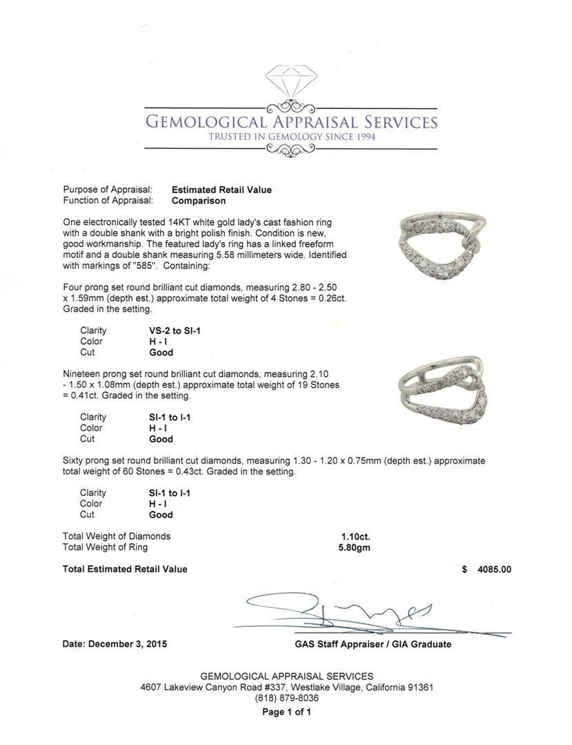 One electronically tested 14KT white gold lady's cast fashion ring with a double shank with a bright polish finish. The featured lady's ring has a linked freeform motif and a double shank measuring 5.58 millimeters wide. Identified with markings of "585". Condition is new, good workmanship. Containing: Four prong set round brilliant cut diamonds, measuring 2.80 - 2.50 x 1.59mm (depth est.) approximate total weight of 4 Stones = 0.26ct. Graded in the setting. Clarity: VS-2 to SI-1. Color: H - I. Cut Good Nineteen prong set round brilliant cut diamonds, measuring 2.10 - 1.50 x 1.08mm (depth est.) approximate total weight of 19 Stones = 0.41ct. Graded in the setting. Clarity: SI-1 to I-1. Color: H - I. Cut Good Sixty prong set round brilliant cut diamonds, measuring 1.30 - 1.20 x 0.75mm (depth est.) approximate total weight of 60 Stones = 0.43ct. Graded in the setting. Clarity: SI-1 to I-1. Color: H - I. Cut Good. Total Weight of Diamonds 1.10 ct. Total Weight of Ring 5.80gm. GAS Appraised at $4,085.00. GAS Appraised.