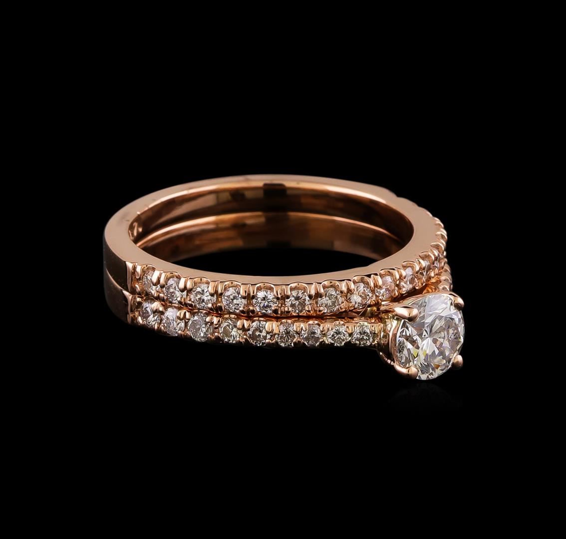 One set electronically tested 14KT rose gold lady's cast wedding ring & wedding band with a bright polish finish. The featured lady's ring set has a double shank measuring 4.60 millimeters wide. Identified with markings of "14K". Condition is new, good workmanship. Containing: One prong set round brilliant cut diamond, measuring 5.13 - 5.11 x 3.23mm (depth est.) approximate weight of 0.55ct. Graded in the setting. Clarity: SI-2. Color: G - Very Good Six prong set round brilliant cut diamonds, measuring 1.85 - 1.75 x 1.10mm (depth est.) approximate total weight of 6 Stones = 0.13ct. Graded in the setting. Clarity: SI-1 to SI-2. Color: H - I. Cut Good Twenty-Three prong set round brilliant cut diamonds, measuring 1.60 - 1.55 x 0.98mm (depth est.) approximate total weight of 23 Stones = 0.35ct. Graded in the setting. Clarity: SI-1 to SI-2. Color: G - I. Cut Good Six prong set round brilliant cut diamonds, measuring 1.50 - 1.40 x 0.90mm (depth est.) approximate total weight of 6 Stones = 0.07ct. Graded in the setting. Clarity: SI-1 to SI-2. Color: H - I. Cut Good. Total Weight of Diamonds 1.10ct. Total Weight of Ring & Wedding Band 5.60gm. GAS Appraised at $6,490.00.