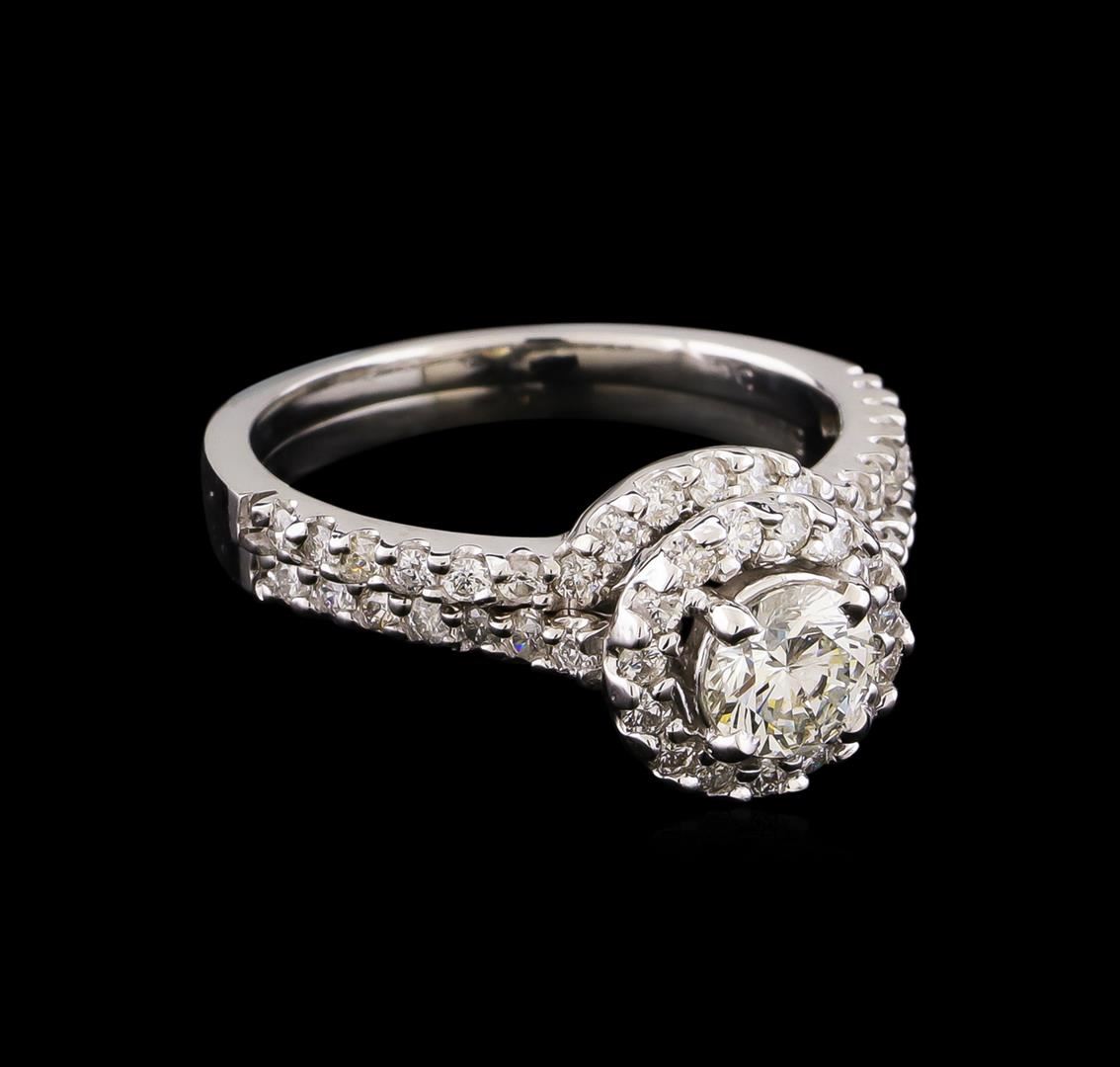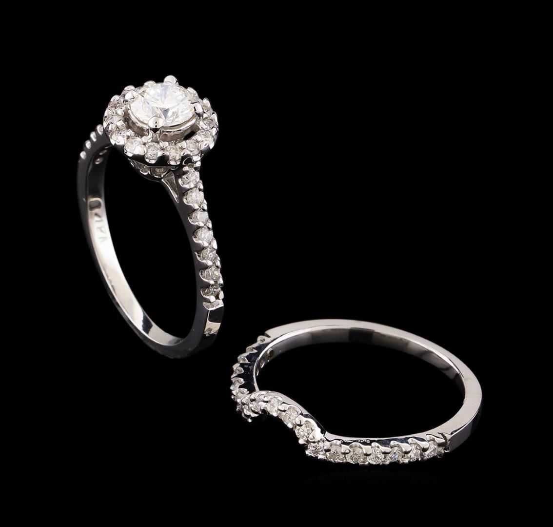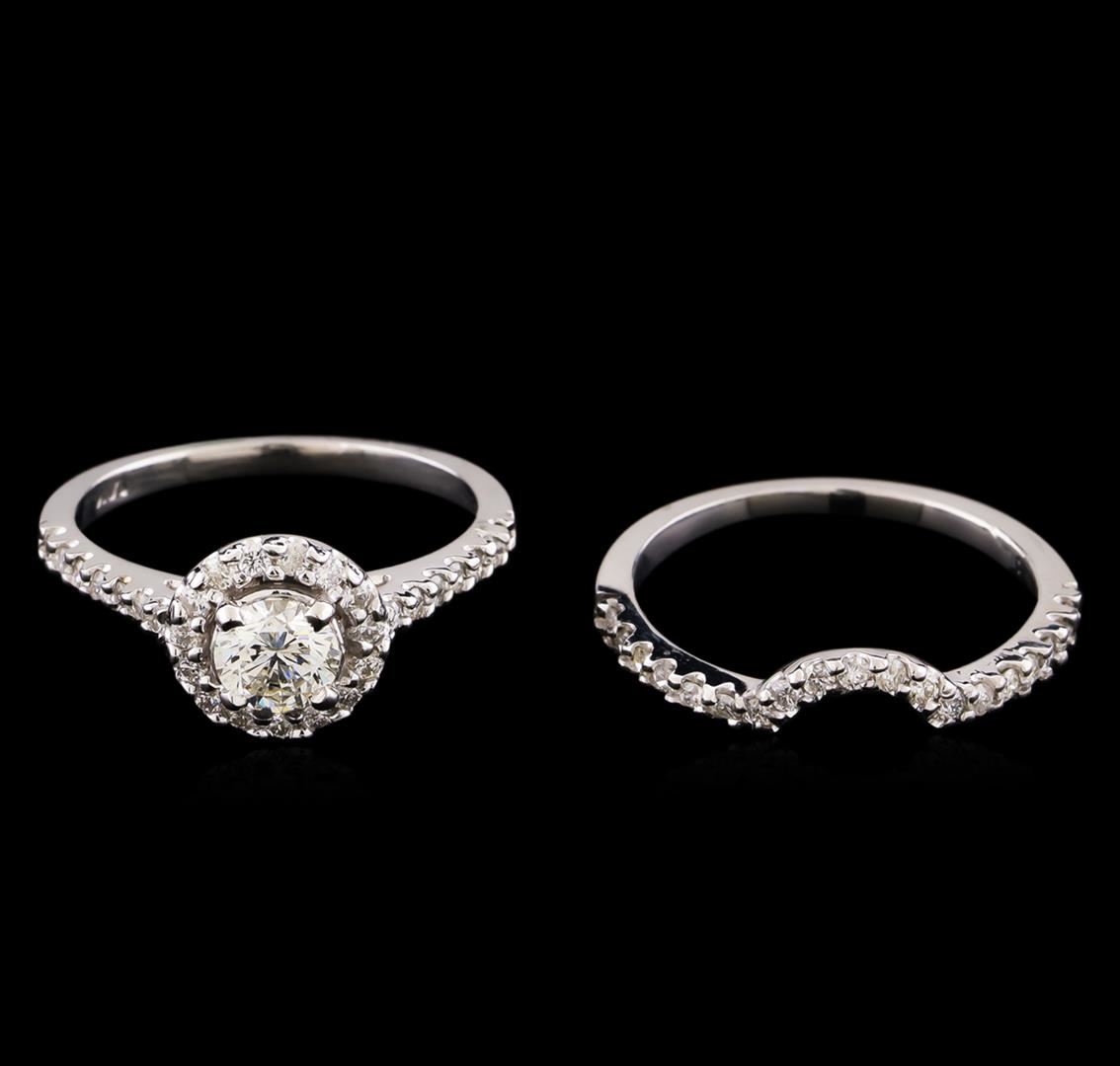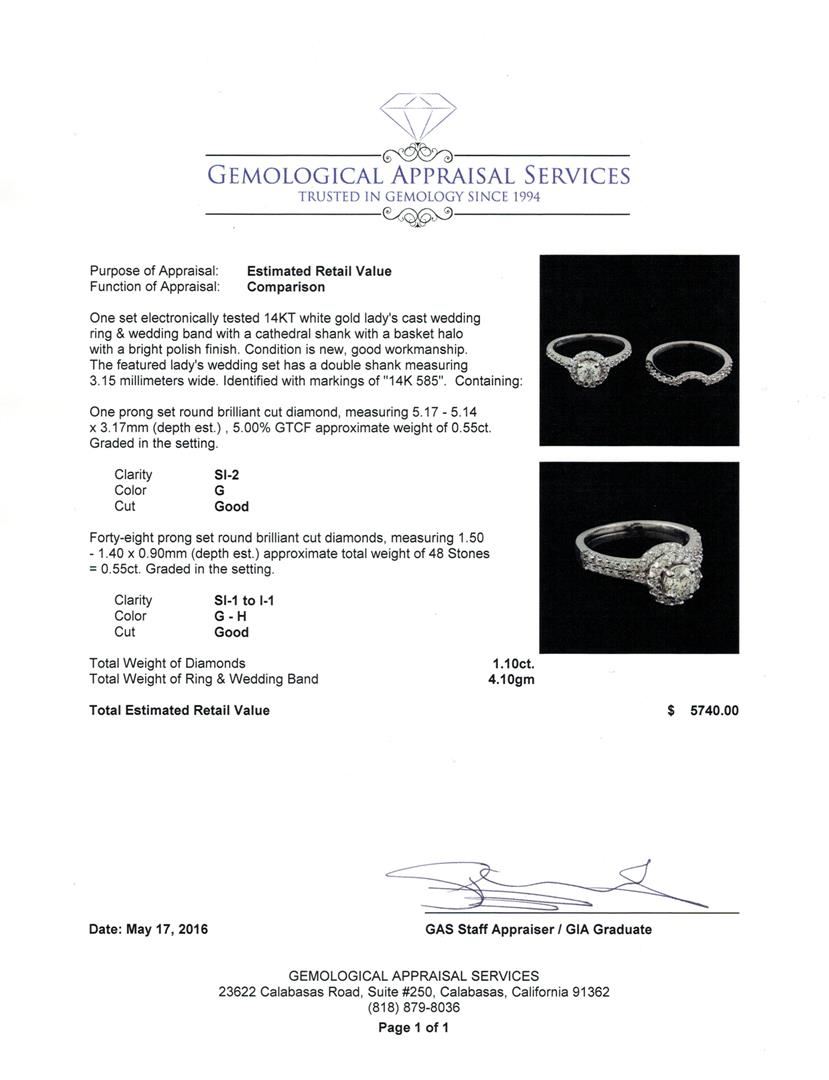 One set electronically tested 14KT white gold lady's cast wedding ring & wedding band with a cathedral shank with a basket halo with a bright polish finish. The featured lady's wedding set has a double shank measuring 3.15 millimeters wide. Identified with markings of "14K 585". Condition is new, good workmanship. Containing: One prong set round brilliant cut diamond, measuring 5.17 - 5.14 x 3.17mm (depth est.) , 5.00.%. GTCF approximate weight of 0.55ct. Graded in the setting. Clarity: SI-2. Color: Good Forty-Eight prong set round brilliant cut diamonds, measuring 1.50 - 1.40 x 0.90mm (depth est.) approximate total weight of 48 Stones = 0.55ct. Graded in the setting. Clarity: SI-1 to I-1. Color: G - Good. Total Weight of Diamonds 1.10ct. Total Weight of Ring & Wedding Band 4.10gm. GAS Appraised at $5,740.00.