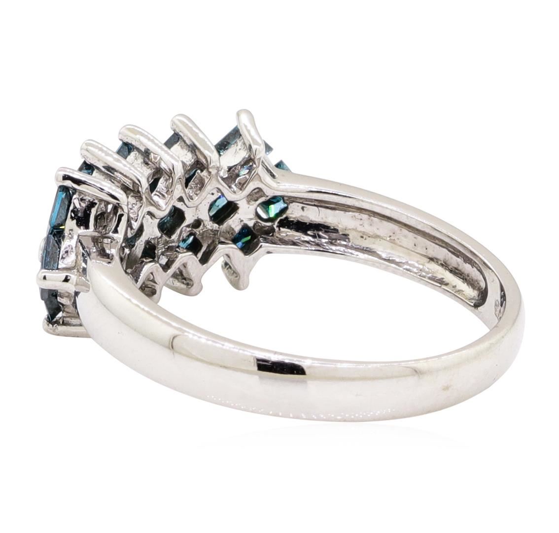 One electronically tested 14KT white gold lady's cast fashion ring with a straight line cathedral shank with a bright polish finish. The featured lady's ring has a shank measuring 2.80 millimeters wide. Identified with markings of '14K'. Condition is new, good workmanship. Containing: Sixteen prong set princess cut treated diamonds, measuring 2.30 x 2.20 x 1.65mm (depth est.) approximate total weight of 16 Stones = 1.10ct. Colored gemstones are presumed to have been subjected to commonly used enhancement processes. Graded in the setting. Color Fancy Dark Greenish Blue Clarity VS-2 to SI-1 Cut Very Good. Total Weight of Diamonds 1.10ct.. Total Weight of Ring 3.30gm GAS Appraised at $2425.00. GAS Appraised.