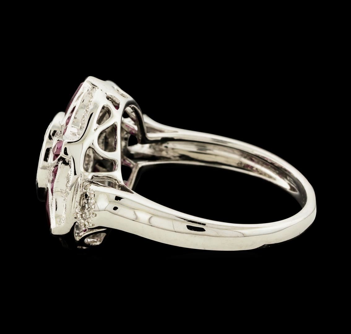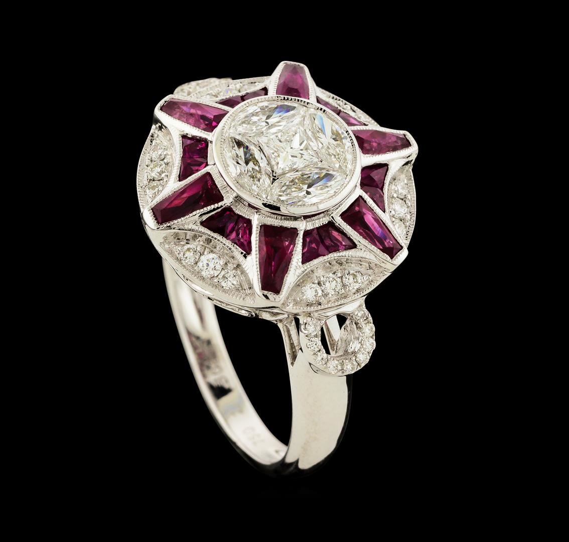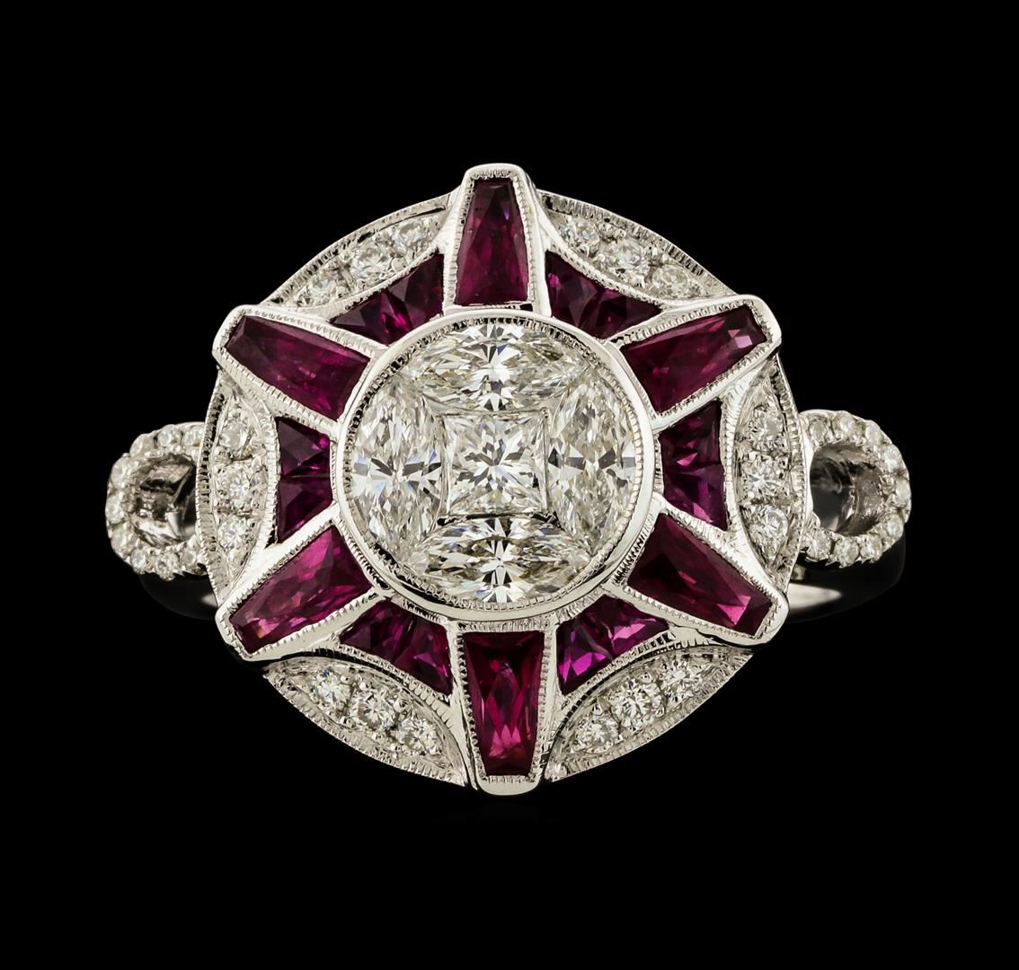 One electronically tested 18KT white gold lady's cast fashion ring with a cathedral shank with a bright polish with milgrain detailing finish. The featured lady's ring has a vintage starburst motif and a shank measuring 2.28 millimeters wide. Identified with markings of '750'. Condition is new, good workmanship. Containing: Six bezel set brilliant trapezoid modified brilliant cut natural rubies, measuring 3.80 x 1.80 x 1.17mm, (depth est.) approximate total weight of 0.60ct., clarity is slightly included, medium dark, moderately strong, slightly purplish red color, (GIA slpR 6/4), cut is very good. Transmitting light with a minimum of distortion, transparent. Colored gemstones are presumed to have been subjected to commonly used enhancement processes. Graded in the setting. Twelve bezel set brilliant trapezoid modified brilliant cut natural rubies, measuring 2.10 x 1.50 x 0.98mm, (depth est.) approximate total weight of 0.50ct., clarity is slightly included, medium dark, moderately strong, slightly purplish red color, (GIA slpR 6/4), cut is good. Transmitting light with a minimum of distortion, transparent. Colored gemstones are presumed to have been subjected to commonly used enhancement processes. Graded in the setting. Four invisible set marquise shaped cut diamonds, measuring 5.00 x 2.50 x 1.58mm (depth est.) approximate total weight of 4 Stones = 0.45ct. Graded in the setting. Clarity VS-2 to SI-1. Color: H - I Cut Good One invisible set princess cut diamond, measuring 2.85 x 2.85 x 2.14mm (depth est.) approximate weight of 0.14ct. Graded in the setting. Clarity VS-2. Color: H Cut Very Good Eighteen bead set round brilliant cut diamonds, measuring 1.30 - 1.20 x 0.78mm (depth est.) approximate total weight of 18 Stones = 0.13ct. Graded in the setting. Clarity VS-1 to VS-2. Color: G - H Cut Very Good Eighteen prong set round brilliant cut diamonds, measuring 0.90 - 0.85 x 0.55mm (depth est.) approximate total weight of 18 Stones = 0.05ct. Graded in the setting. Clarity VS-2 to SI-1. Color: G - H Cut Very Good. Total Weight of Colored Stones 1.10ct.. Total Weight of Diamonds 0.77ct.. Total Weight of Ring 6.50gm. GAS Appraised at $4,935.00.