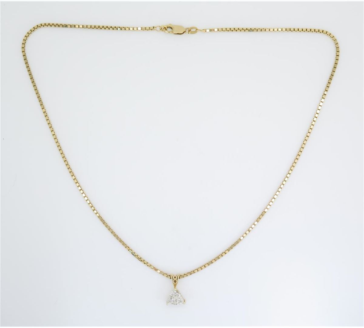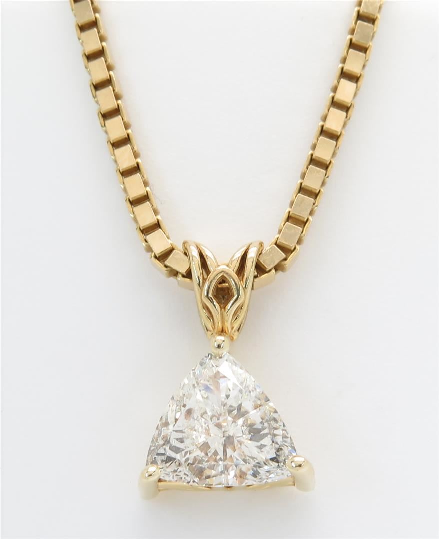 One tested 14K yellow gold diamond pendant. Containing: One Trilliant Cut Diamond. Approximate weight: 1.10CT, Clarity: SI, Color: G-H. Diamonds are graded in the mounting, unless otherwise stated. Weight of necklace: 11.0 grams. Size of chain: 18" long.