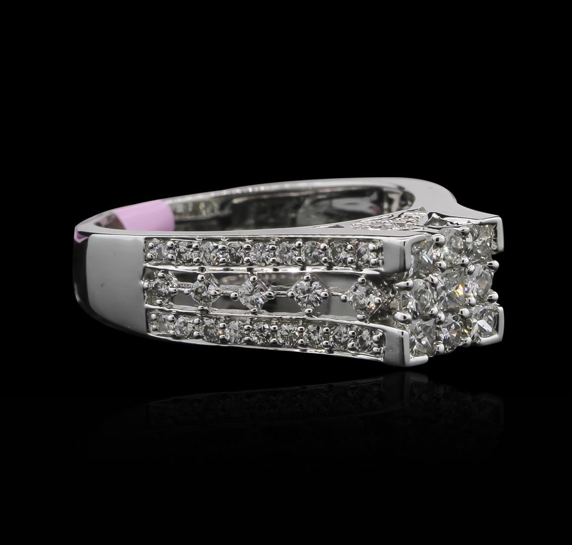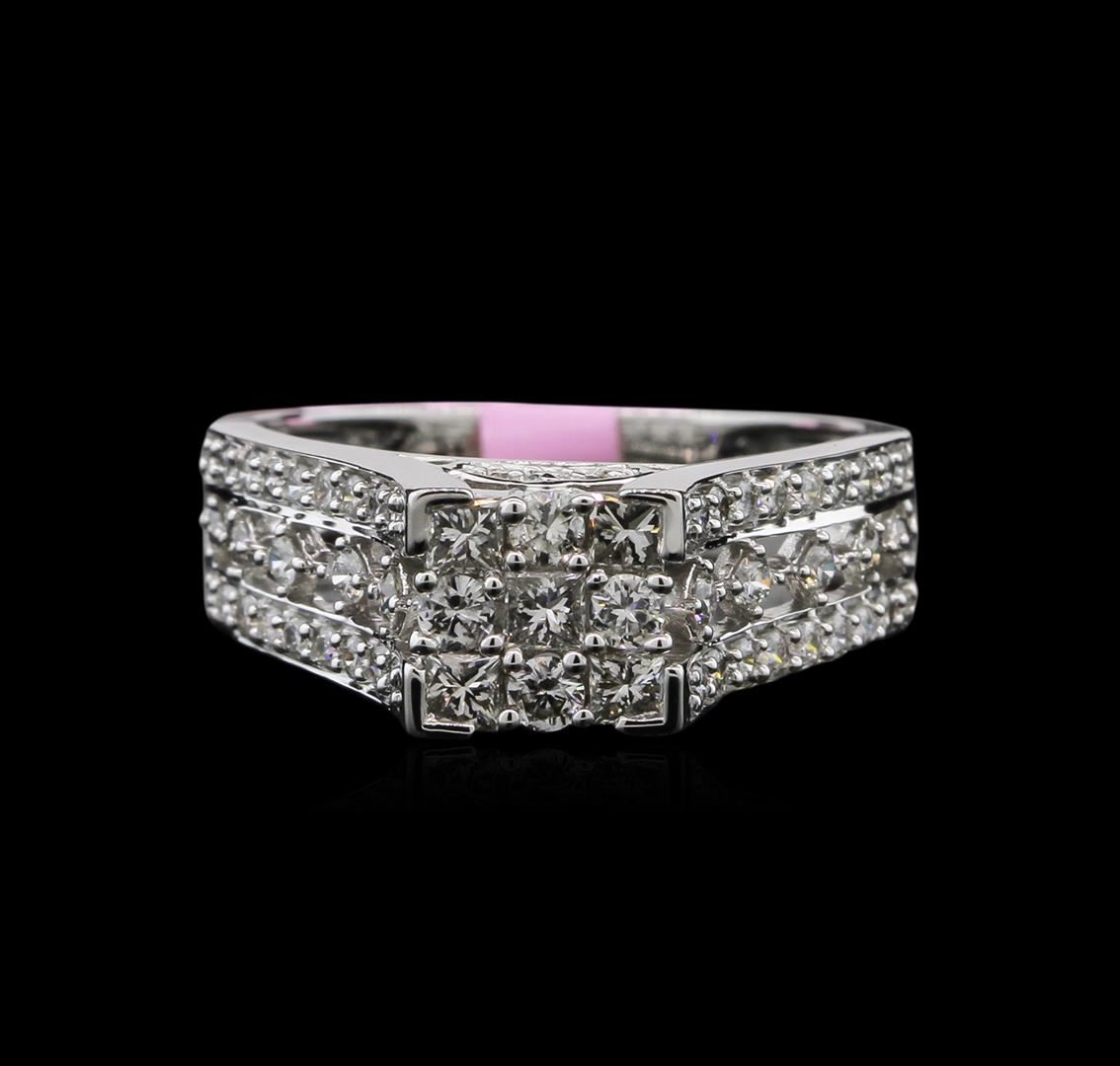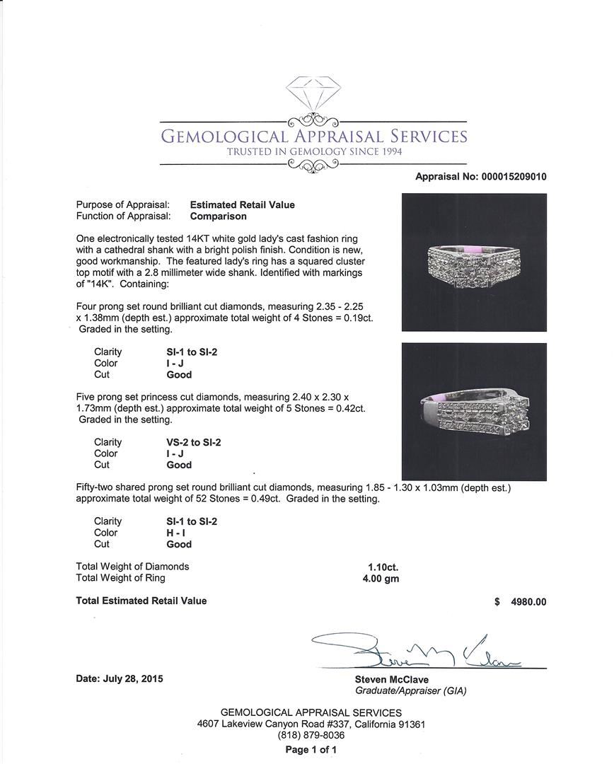 One electronically tested 14KT white gold lady's cast fashion ring with a cathedral shank with a bright polish finish. The featured lady's ring has a squared cluster top motif with a 2.8 millimeter wide shank. Identified with markings of "14K". Condition is new, good workmanship. Containing: Four prong set round brilliant cut diamonds, measuring 2.35 - 2.25 x 1.38mm (depth est.) approximate. Total Weight of 4 Stones = 0.19ct. Graded in the setting. Clarity: SI-1 to SI-2. Color: I - Good Five prong set princess cut diamonds, measuring 2.40 x 2.30 x 1.73mm (depth est.) approximate. Total Weight of 5 Stones = 0.42ct. Graded in the setting. Clarity: VS-2 to SI-2. Color: I - Good Fifty-Two shared prong set round brilliant cut diamonds, measuring 1.85 - 1.30 x 1.03mm (depth est.) approximate. Total Weight of 52 Stones = 0.49ct. Graded in the setting. Clarity: SI-1 to SI-2. Color: H - I. Cut Good. Total Weight of Diamonds 1.10ct. Total Weight of Ring 4.00gm. GAS Appraised at $4,980.00.