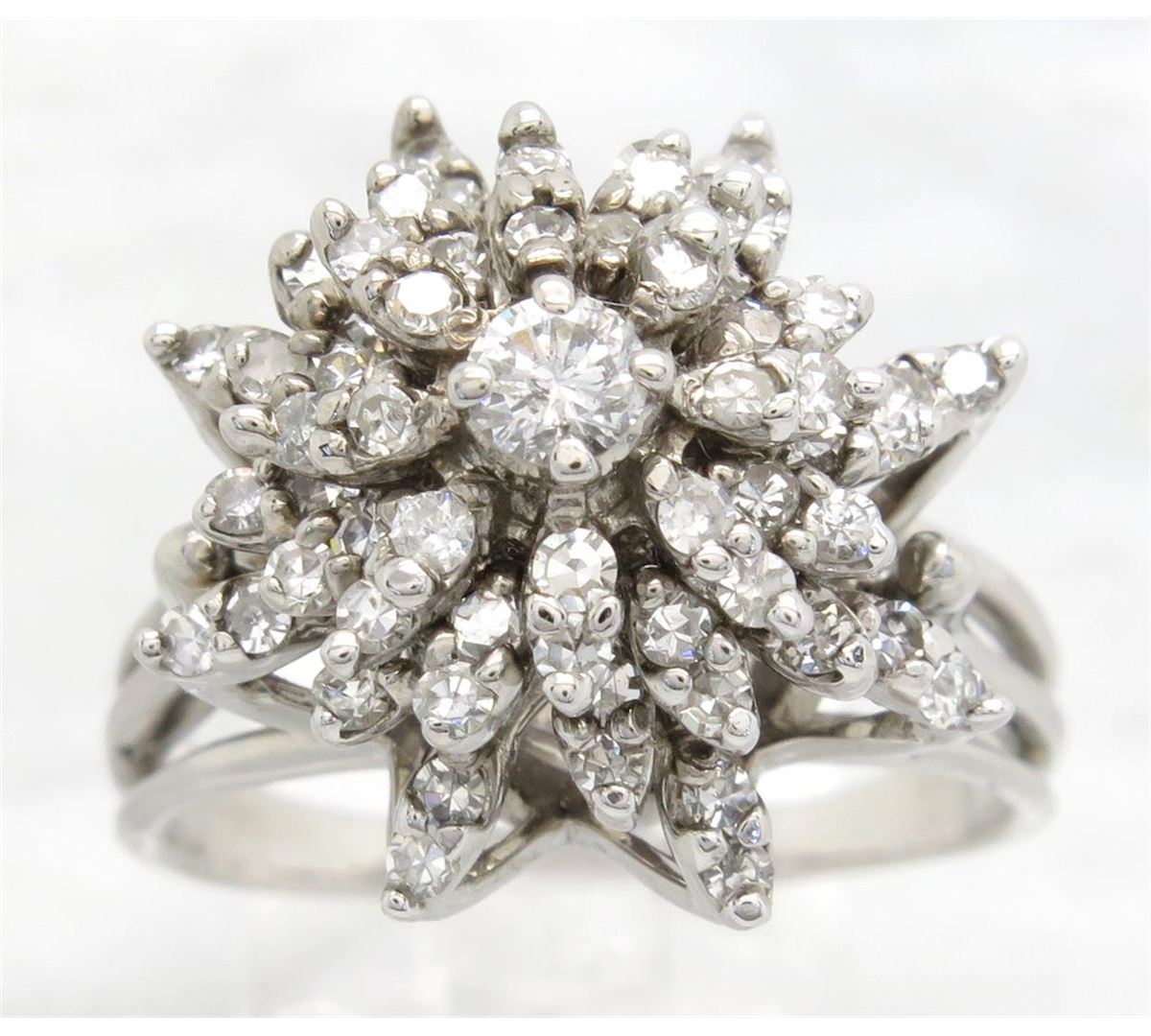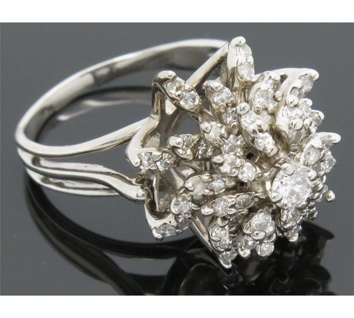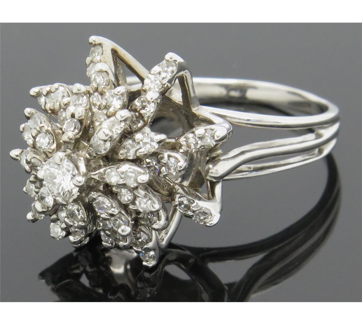 One tested 14K white gold diamond ring. Containing: 1 Round Brilliant Cut Diamond, 64 Single Cut Diamonds. Approximate total diamond weight: 1.10CTW. Diamonds are graded in the mounting, unless otherwise stated. Weight: 9.4 grams. Size: 8.5