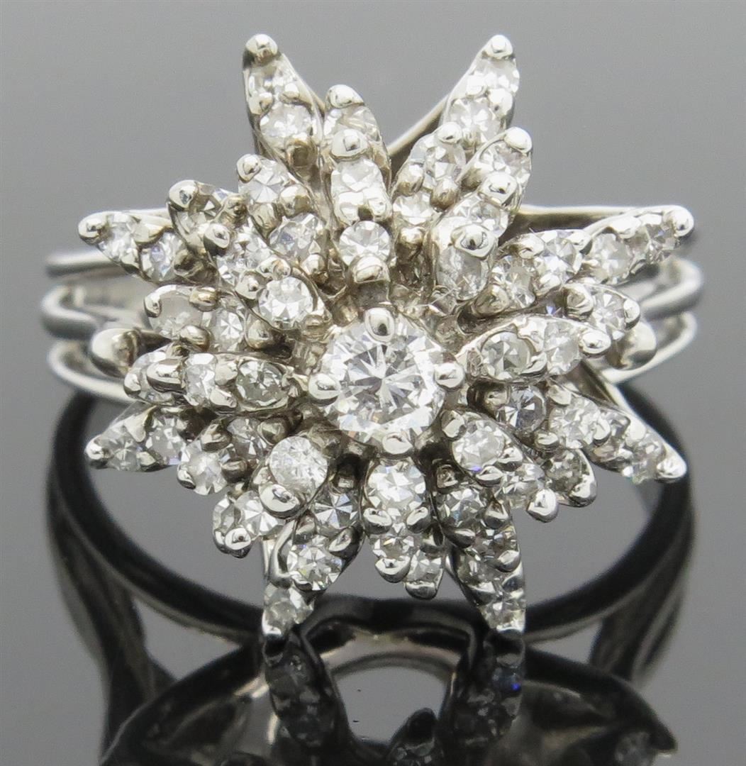 One tested 14K white gold diamond ring. Containing: 1 Round Brilliant Cut Diamond, 64 Single Cut Diamonds. Approximate total diamond weight: 1.10CTW. Diamonds are graded in the mounting, unless otherwise stated. Weight: 9.4 grams. Size: 8.5