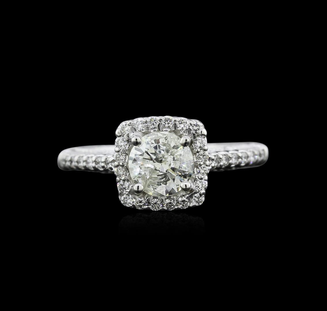 One electronically tested 18KT white gold ladies cast diamond engagement ring with a bright polish finish. Identified with markings of "18K". Condition is new. Containing: One prong set round brilliant cut diamond, measuring 6.20 - 6.20 x 3.72mm (depth es GGL Appraised at $2,340.00.