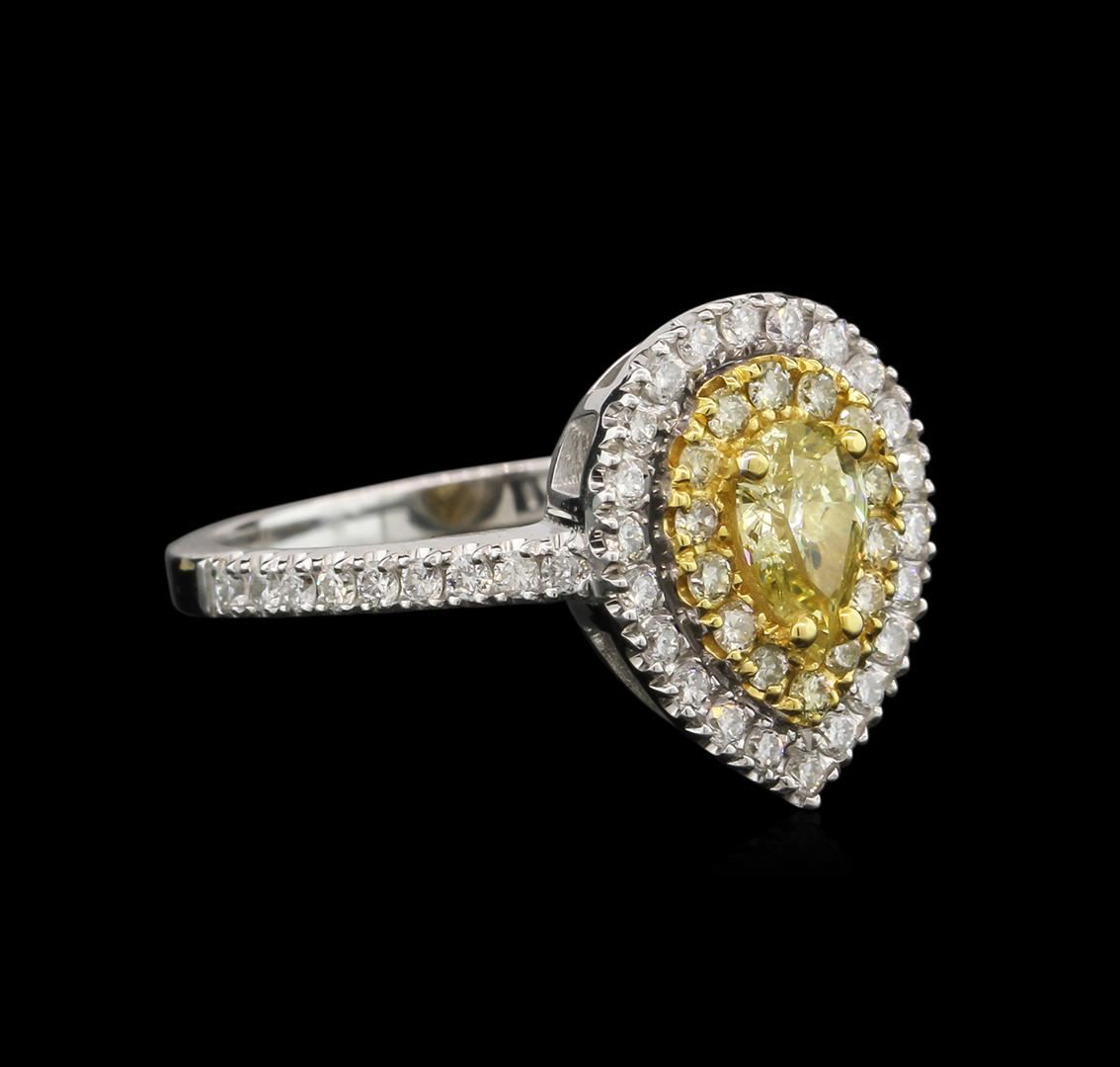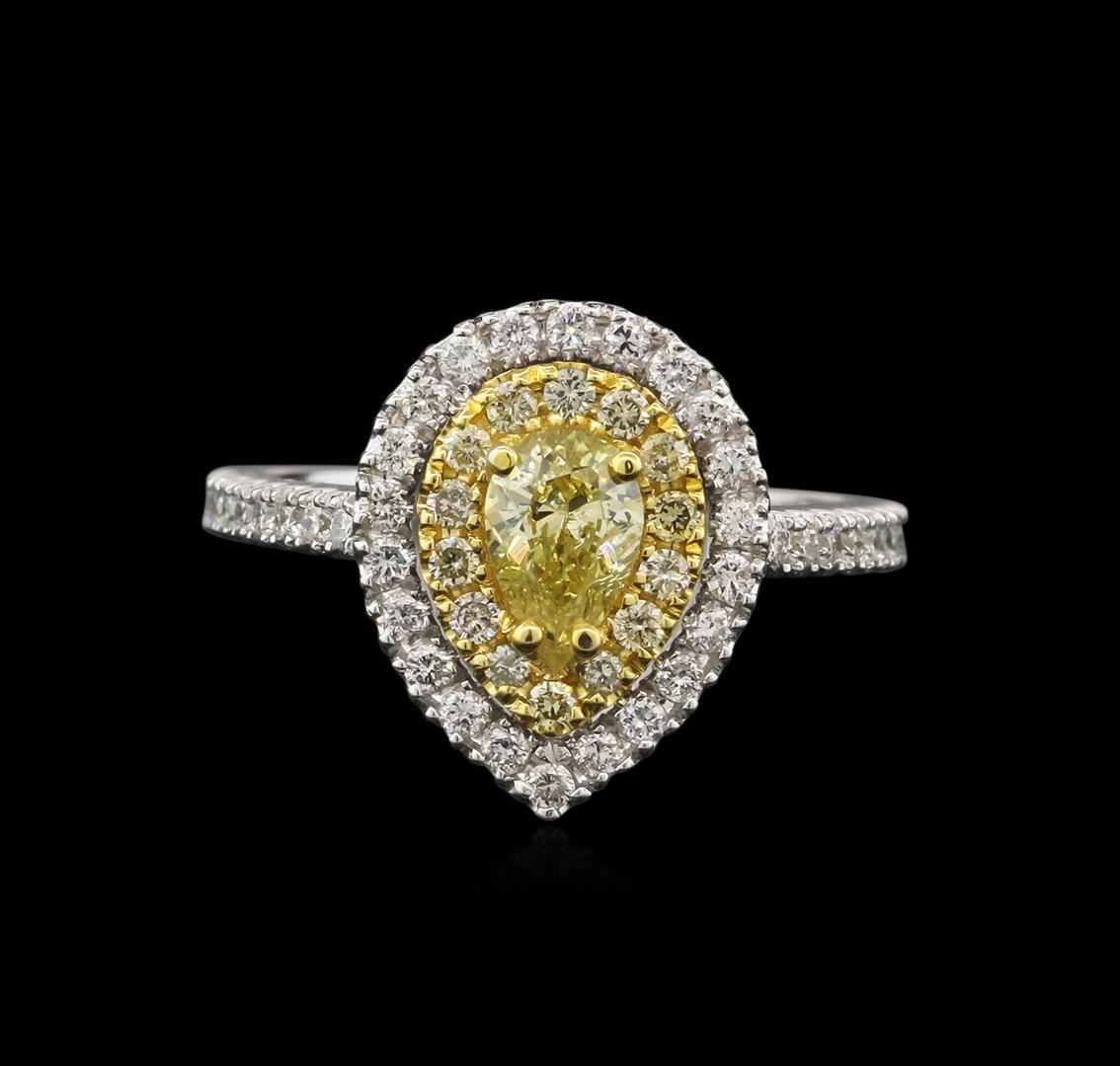 One ring featuring: 14KT white gold weighing 4.32 grams containing one prong set pear shape yellow diamond center stone with a total weight of 0.49ct, prong set round white diamonds with a total weight of 0.43ct and prong set round yellow diamonds with a total weight of 0.18ct.