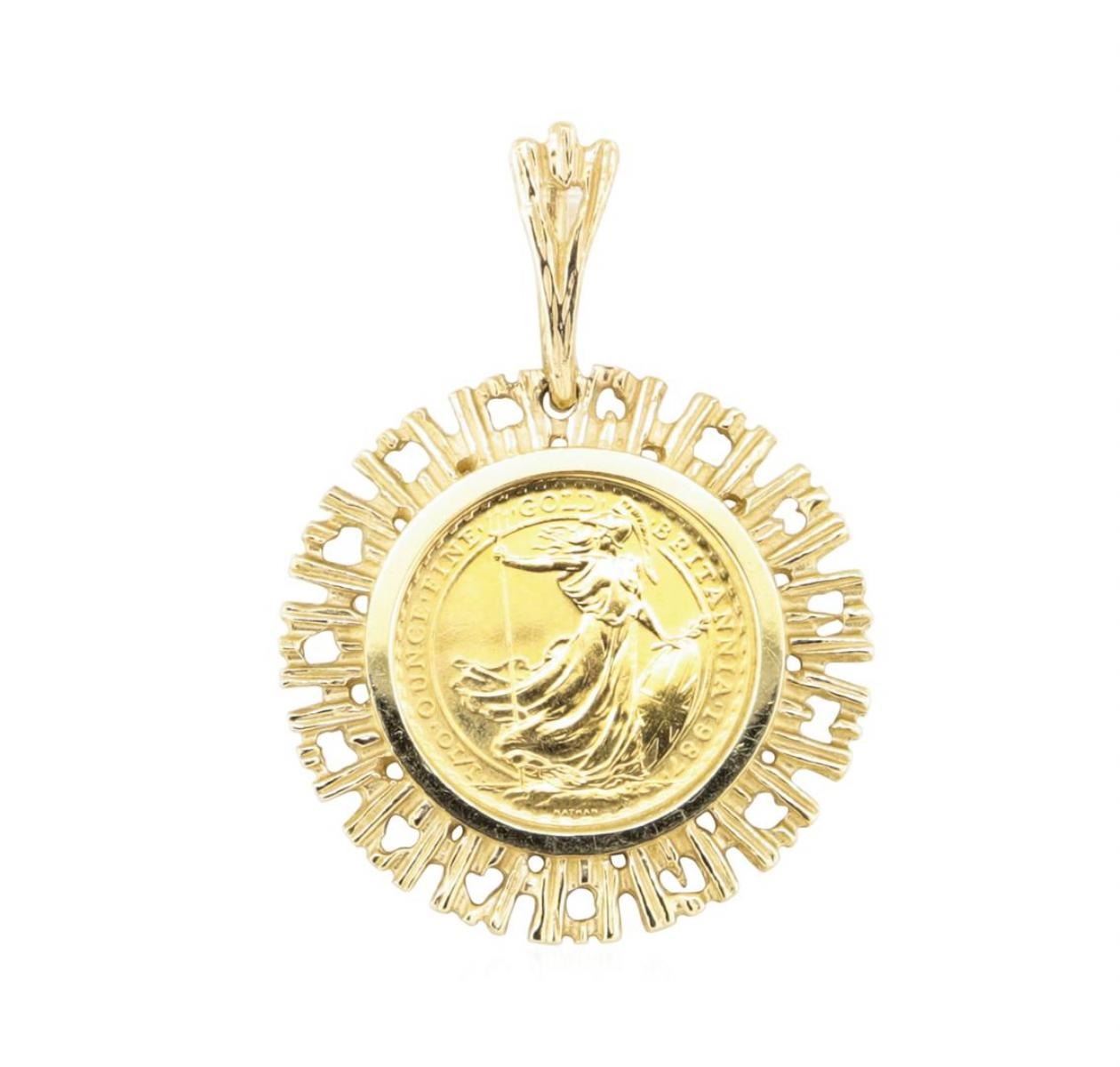 One 1/10th British Sovereign coin pendant with a sunburst frame featuring: 14KT and 24KT yellow gold weighing 6.2 grams.