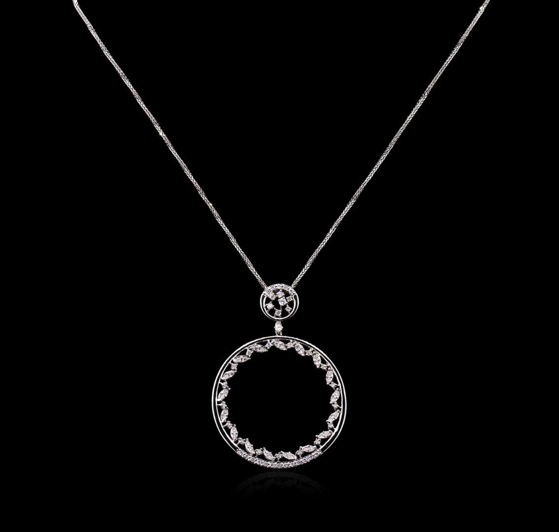 One electronically tested 14KT white gold lady's combination cast & assembled circle pendant & chain 18.0" long, 1.4mm square wheat link with a lobster claw clasp with a bright polish finish. Identified with markings of "14K". Condition is new, good workmanship. Containing: Two prong set round brilliant cut diamonds, measuring 2.30 - 2.20 x 1.46mm (depth est.) approximate total weight of 2 Stones = 0.10ct. Graded in the setting. Clarity: SI-1 . Color: H - I. Cut Good Seventy-Five prong set round brilliant cut diamonds, measuring 1.60 - 1.45 x 0.95mm (depth est.) approximate total weight of 75 Stones = 1.01ct. Graded in the setting. Clarity: SI-1 to SI-2 . Color: H - I. Cut Good. Total Weight of Diamonds 1.11ct.. Total Weight of Pendant & Chain 9.50gm at $ 4705.00 GAS Appraised.
