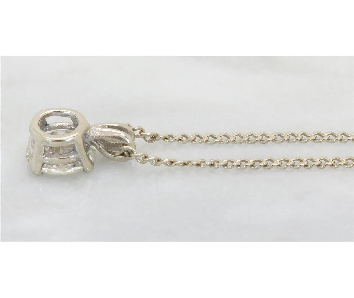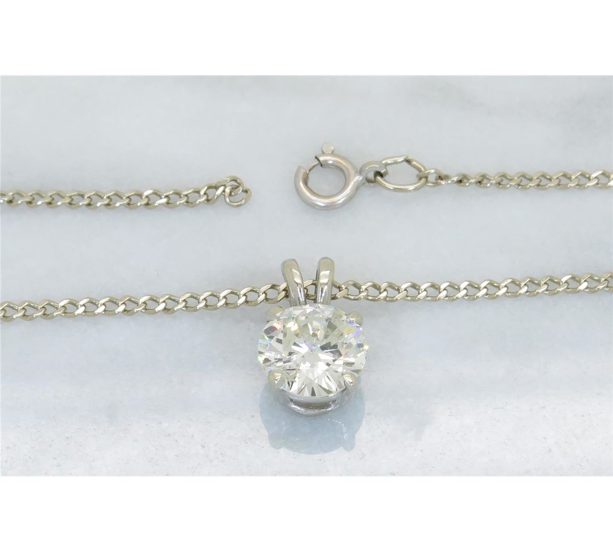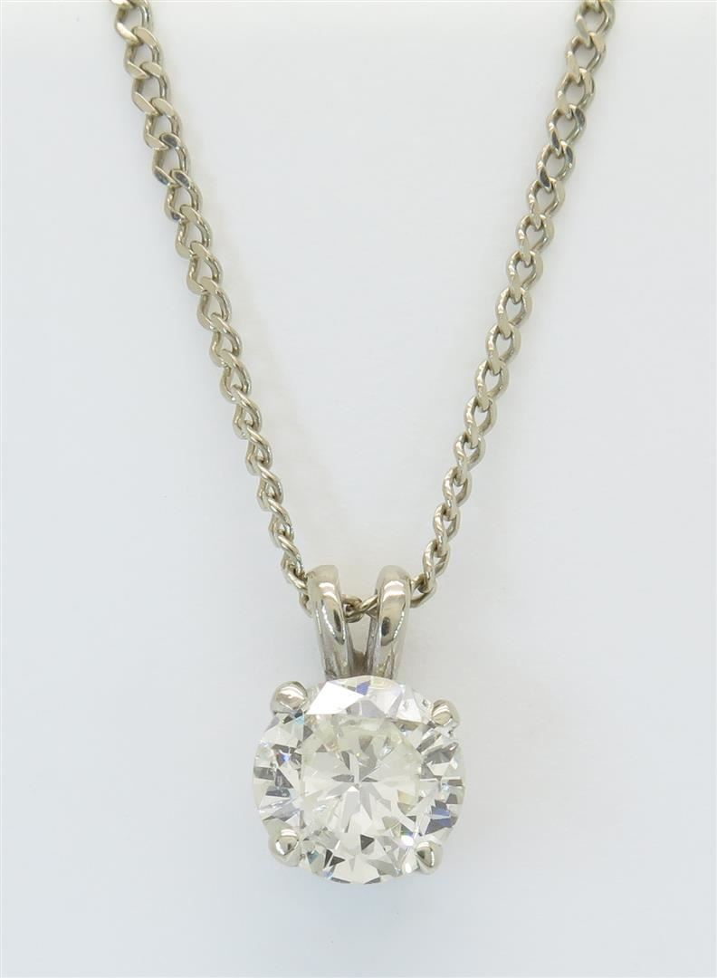 One tested 14K gold diamond pendant. Containing: One Round Brilliant Cut Diamond. Approximate Size: 1.11CT, Clarity: I1, Color: J-K. All diamonds are graded in the mounting unless otherwise stated. Weight of necklace: 3.2 grams, Size of chain: 19" long.
