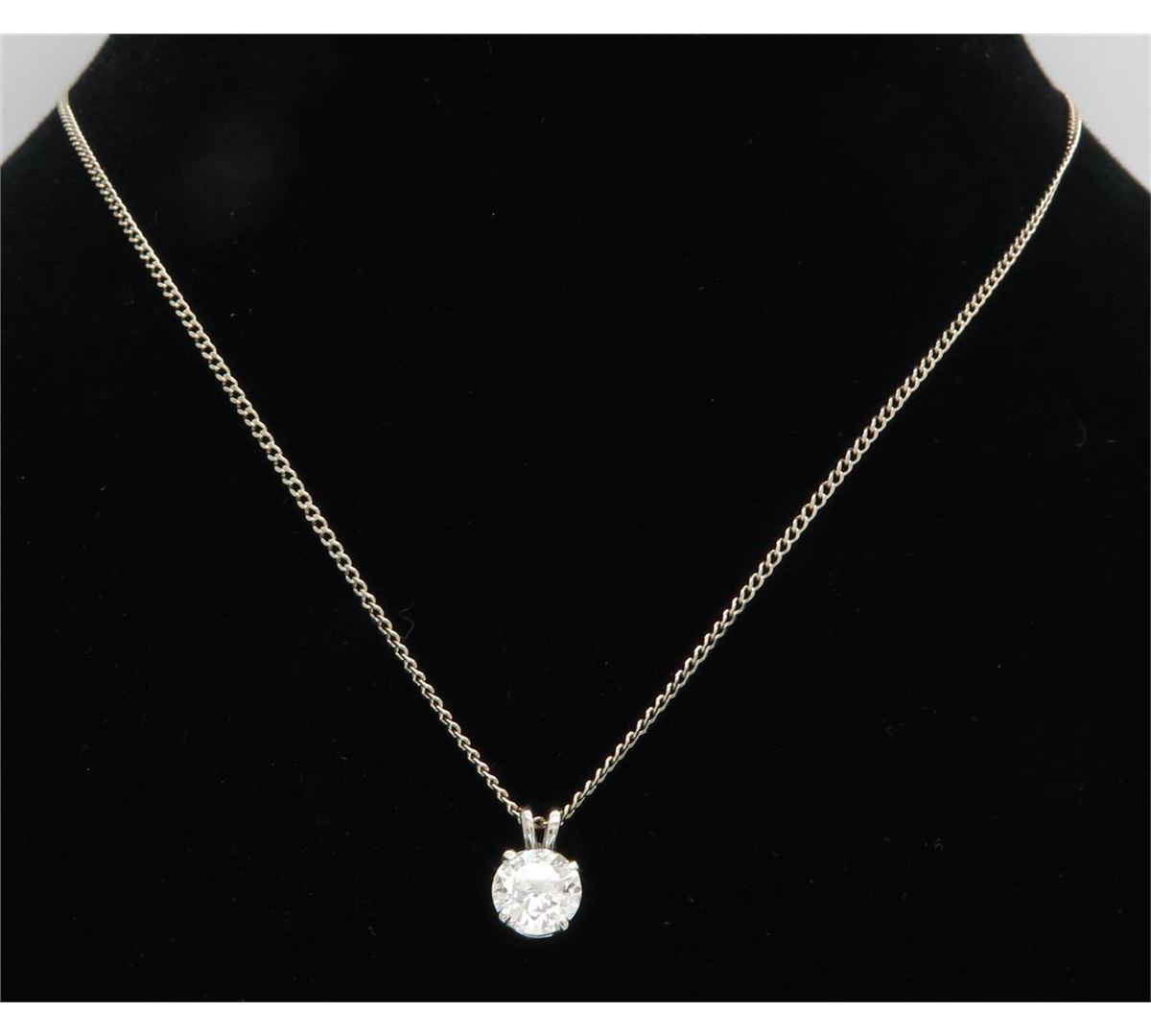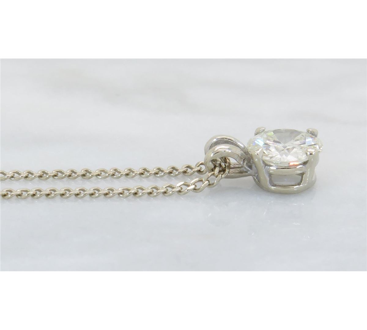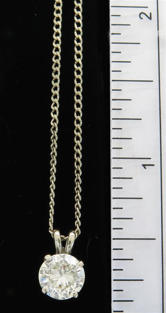 One tested 14K gold diamond pendant. Containing: One Round Brilliant Cut Diamond. Approximate Size: 1.11CT, Clarity: I1, Color: J-K. All diamonds are graded in the mounting unless otherwise stated. Weight of necklace: 3.2 grams, Size of chain: 19" long.