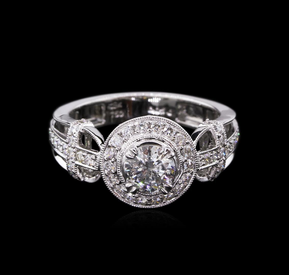 One electronically tested 18KT white gold lady's cast halo wedding ring with a bright polish with milgrain detailing finish. The featured lady's ring has a shank measuring 3.64 millimeters in width. Identified with markings of "18K 750". Condition is new, good workmanship. Containing: One prong set round brilliant cut diamond, measuring 5.61 - 5.60 x 3.20mm (depth est.) approximate weight of 0.61ct. Graded in the setting. Clarity: I-1. Color: H - I. Cut Good Forty-Eight bead set round brilliant cut diamonds, measuring 1.40 - 1.35 x 0.90mm (depth est.) approximate total weight of 48 Stones = 0.50ct. Graded in the setting. Clarity: SI-1 to SI-2. Color: G - I. Cut Good. Total Weight of Diamonds 1.11ct. Total Weight of Wedding Ring 5.60gm GAS Appraised at $5,840.00.