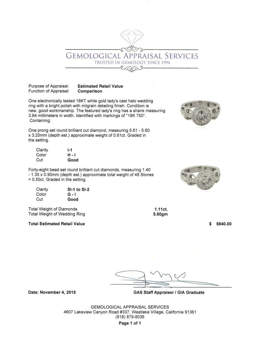 One electronically tested 18KT white gold lady's cast halo wedding ring with a bright polish with milgrain detailing finish. The featured lady's ring has a shank measuring 3.64 millimeters in width. Identified with markings of "18K 750". Condition is new, good workmanship. Containing: One prong set round brilliant cut diamond, measuring 5.61 - 5.60 x 3.20mm (depth est.) approximate weight of 0.61ct. Graded in the setting. Clarity: I-1. Color: H - I. Cut Good Forty-Eight bead set round brilliant cut diamonds, measuring 1.40 - 1.35 x 0.90mm (depth est.) approximate total weight of 48 Stones = 0.50ct. Graded in the setting. Clarity: SI-1 to SI-2. Color: G - I. Cut Good. Total Weight of Diamonds 1.11ct. Total Weight of Wedding Ring 5.60gm GAS Appraised at $5,840.00.