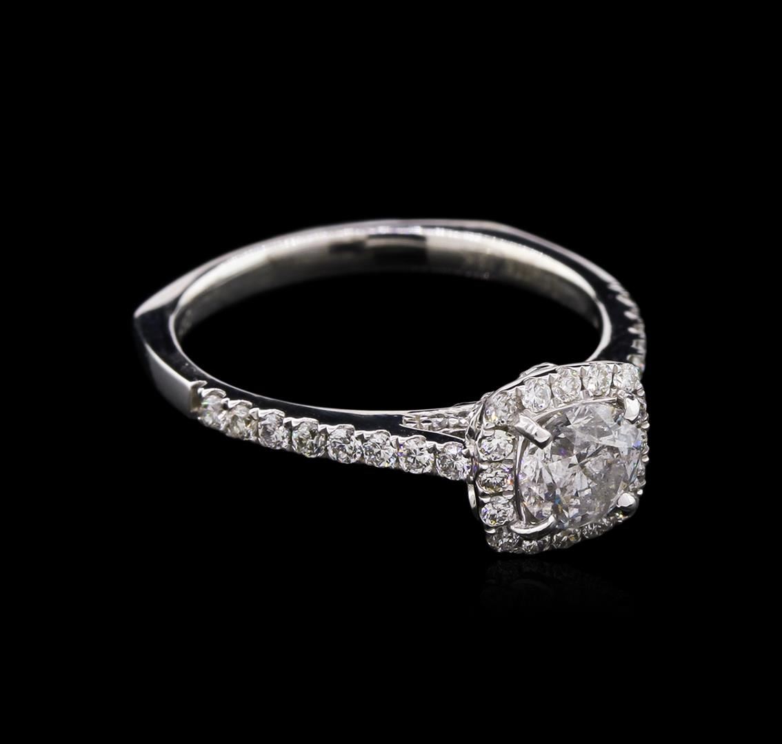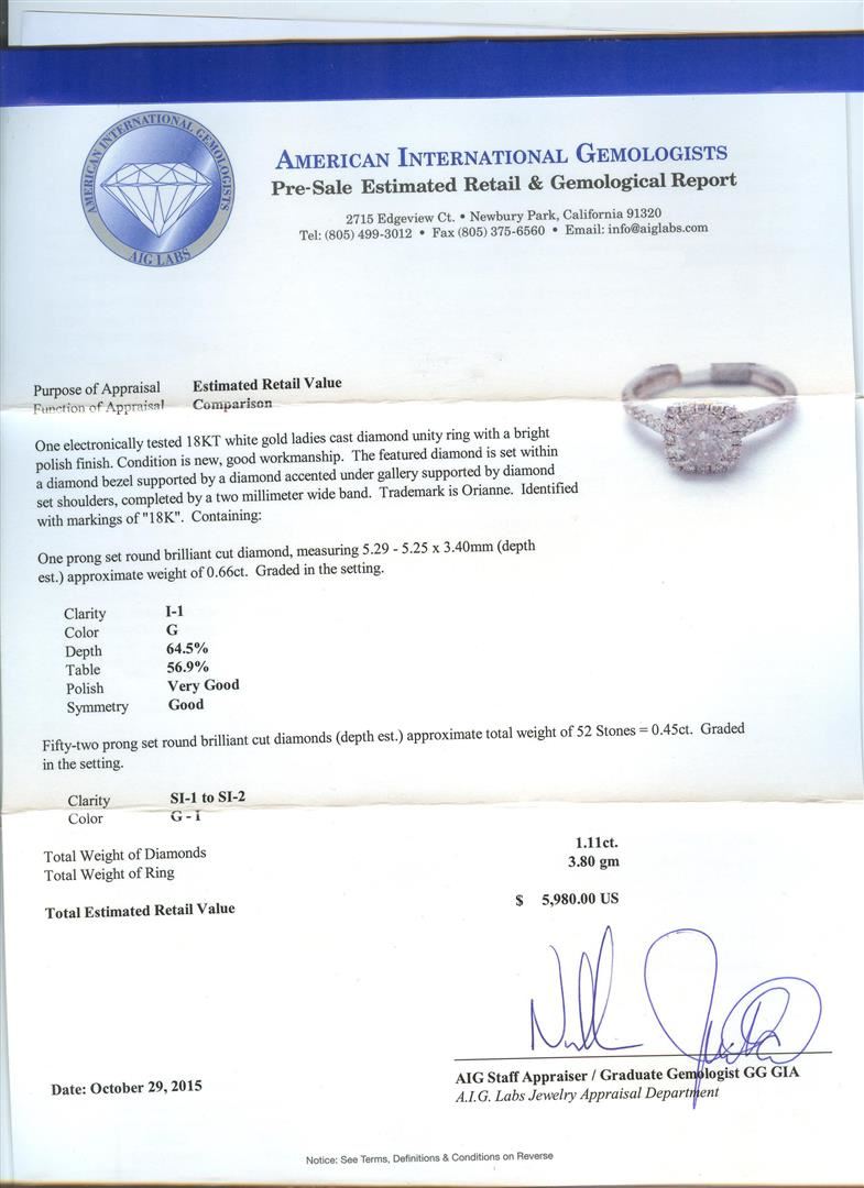 One electronically tested 18KT white gold ladies cast diamond unity ring with a bright polish finish. The featured diamond is set within a diamond bezel supported by a diamond accented under gallery supported by diamond set shoulders, completed by a two millimeter wide band. Trademark is Orianne. Identified with markings of "18K". Condition is new, good workmanship. Containing: One prong set round brilliant cut diamond, measuring 5.29 - 5.25 x 3.40mm (depth est.) approximate weight of 0.66ct. Graded in the setting. Clarity: I-1. Color: 64.5%. Table 56.9%. Fifty-Two prong set round brilliant cut diamonds (depth est.) approximate total weight of 52 Stones = 0.45ct. Graded in the setting. Clarity: SI-1 to SI-2. Color: G - I. Total Weight of Diamonds 1.11ct. Total Weight of Ring 3.80gm. AIG Appraised at $5,980.00.