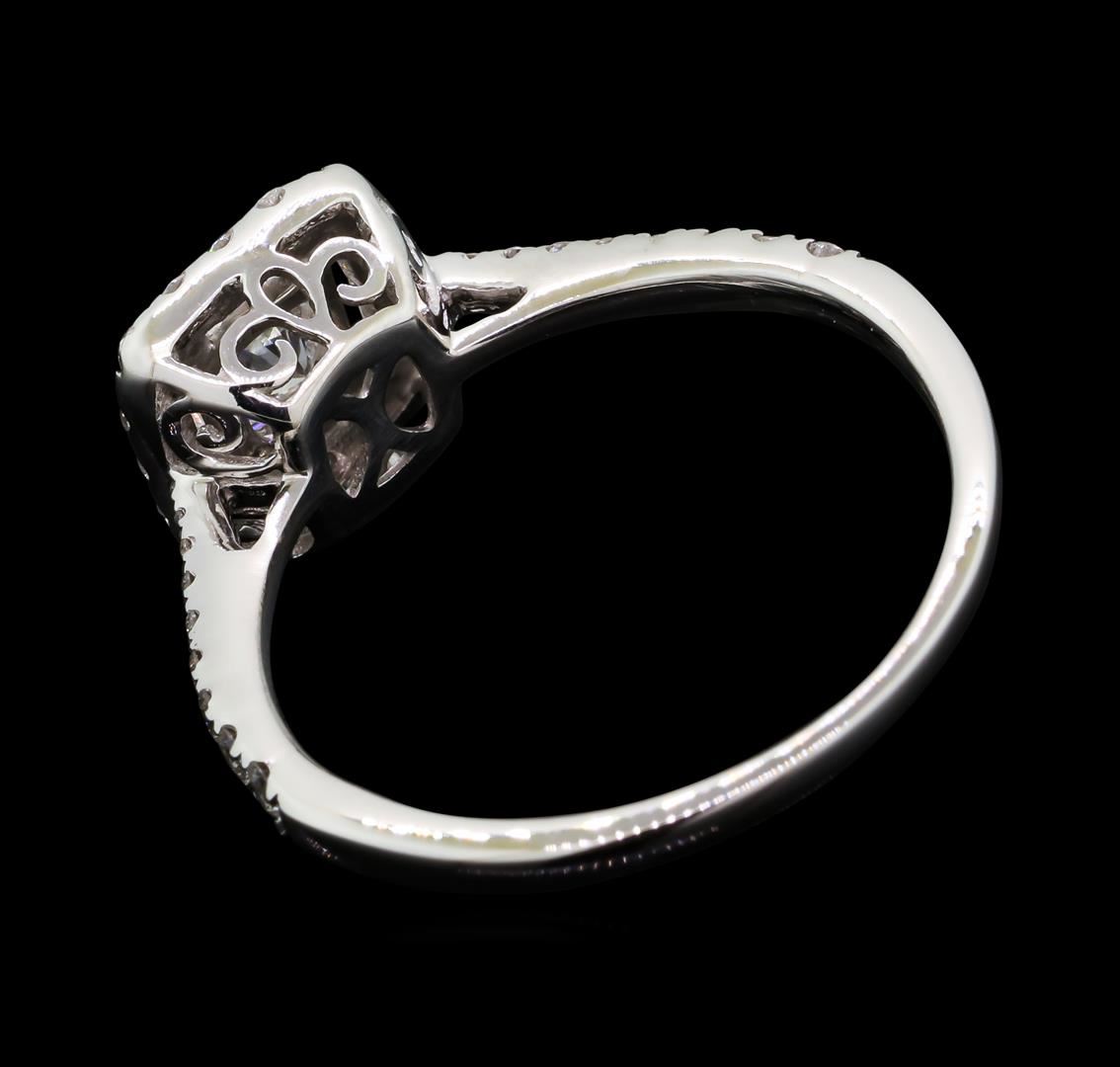 One electronically tested 18KT white gold lady's cast wedding ring with a cathedral shank with a basket halo with a bright polish finish. The featured lady's ring has a shank measuring 1.65 millimeters wide. Identified with markings of '750'. Condition is new, good workmanship. Containing: One prong set round brilliant cut diamond, measuring 5.63 - 5.61 x 3.37mm (depth est.) , 5.00.%. GTCF approximate weight of 0.70ct. Graded in the setting. Clarity I-1. Color: H Cut Good Eighteen prong set round brilliant cut diamonds, measuring 1.70 - 1.60 x 1.02mm (depth est.) approximate total weight of 18 Stones = 0.31ct. Graded in the setting. Clarity VS-1 to VS-2. Color: G - H Cut Very Good Sixteen prong set round brilliant cut diamonds, measuring 1.30 - 1.05 x 0.73mm (depth est.) approximate total weight of 16 Stones = 0.10ct. Graded in the setting. Clarity VS-1 to VS-2. Color: G - H Cut Very Good. Total Weight of Diamonds 1.11ct.. Total Weight of Ring 2.80gm GAS Appraised at $5,995.00.