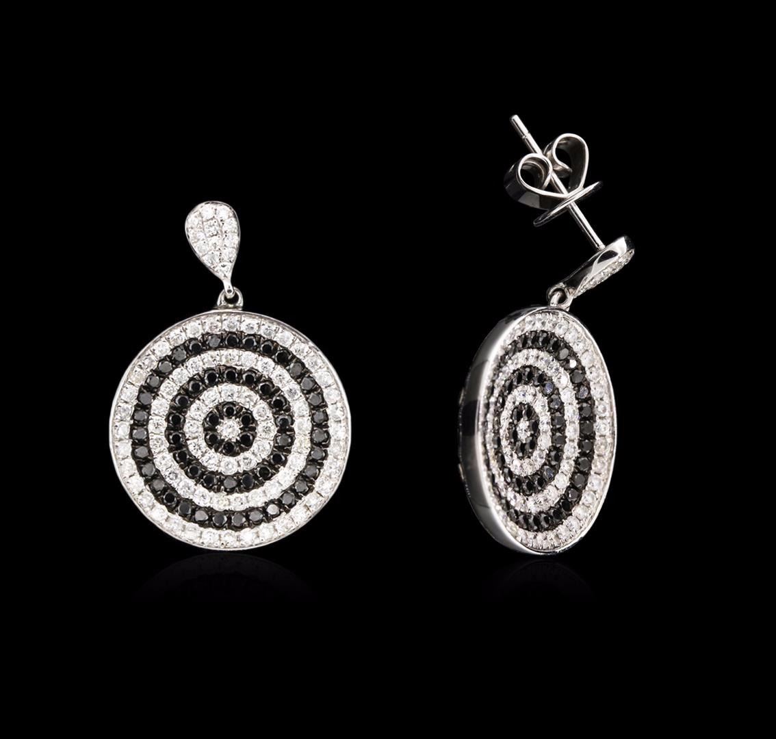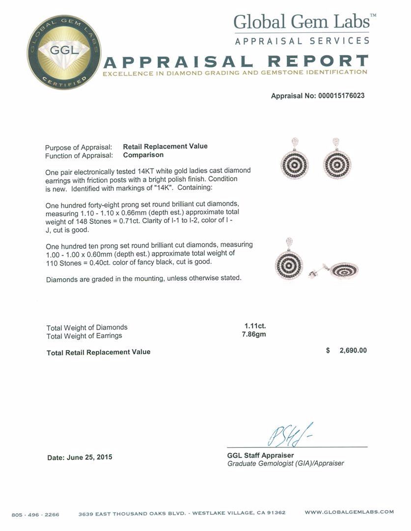 One pair electronically tested 14KT white gold ladies cast diamond earrings with friction posts with a bright polish finish. Identified with markings of "14K". Condition is new. Containing: One Hundred Forty-Eight prong set round brilliant cut diamonds, measuring 1.10 - 1.10 x 0.66mm (depth est.) approximate. Total Weight of 148 Stones = 0.71ct. Clarity: I-1 to I-2. Color: I - J, Cut is Good. One Hundred Ten prong set round brilliant cut diamonds, measuring 1.00 - 1.00 x 0.60mm (depth est.) approximate. Total Weight of 110 Stones = 0.40ct. Cut is Good. Diamonds are graded in the mounting, unless otherwise stated. Total Weight of Diamonds 1.11ct. Total Weight of Earrings 7.86 grams. GGL Appraised at $2,690.00.