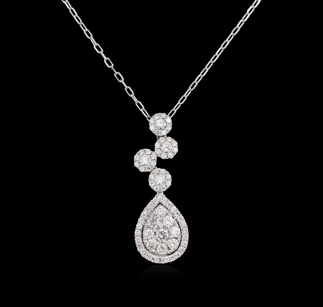 One electronically tested 14KT white gold lady's combination cast & assembled fashion pendant & chain 16.0" long, 0.80mm diamond cut cable link with a lobster claw clasp with a bright polish finish. Identified with markings of "14K". Condition is new, good workmanship. Containing: One prong set round brilliant cut diamond, measuring 2.80 - 2.80 x 1.80mm (depth est.) approximate weight of 0.09ct. Graded in the setting. Clarity SI-2 Color I. Cut Good Twelve prong set round brilliant cut diamonds, measuring 2.50 - 2.40 x 1.47mm (depth est.) approximate total weight of 12 Stones = 0.60ct. Graded in the setting. Clarity SI-2 to I-1 Color H - I. Cut Good Fifty-Nine prong set round brilliant cut diamonds, measuring 1.30 - 1.20 x 0.75mm (depth est.) approximate total weight of 59 Stones = 0.42ct. Graded in the setting. Clarity SI-1 to SI-2 Color H - I. Cut Good Total Weight of Diamonds 1.11ct. Total Weight of Pendant & Chain 4.30gm GAS Appraised at $4,785.00.