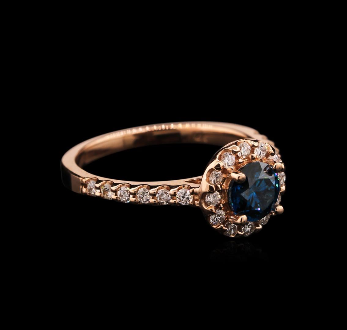 One ring featuring: 14KT rose gold weighing 3.08 grams containing one blue diamond center stone with a total weight of 0.75ct and 24 white side diamonds with a total weight of 0.37ct.