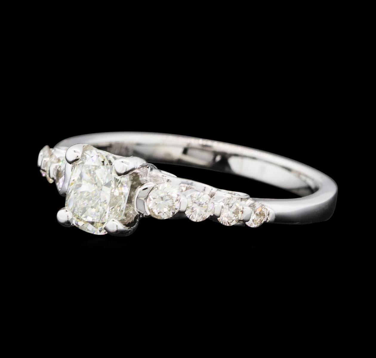One electronically tested 14KT white gold lady's cast wedding ring with a cathedral shank with a bright polish finish. The featured lady's ring has a scrolled under gallery and a shank measuring 2.00 millimeters wide. Identified with markings of '14K'. Condition is new, good workmanship. Containing: One prong set cushion cut diamond, measuring 5.67 x 4.59 x 3.21mm (depth est.) , 5.00.%. GTCF approximate weight of 0.76ct. Graded in the setting. Color I - J Clarity SI-1 Cut Good Two prong set round brilliant cut diamonds, measuring 2.40 - 2.35 x 1.48mm (depth est.) approximate total weight of 2 Stones = 0.11ct. Graded in the setting. Color I - J Clarity SI-1 to SI-2 Cut Good Twelve prong set round brilliant cut diamonds, measuring 2.00 - 1.50 x 1.09mm (depth est.) approximate total weight of 12 Stones = 0.25ct. Graded in the setting. Color I - J Clarity SI-1 to SI-2 Cut Very Good. Total Weight of Diamonds 1.12ct.. Total Weight of Ring 3.00gm GAS Appraised.
