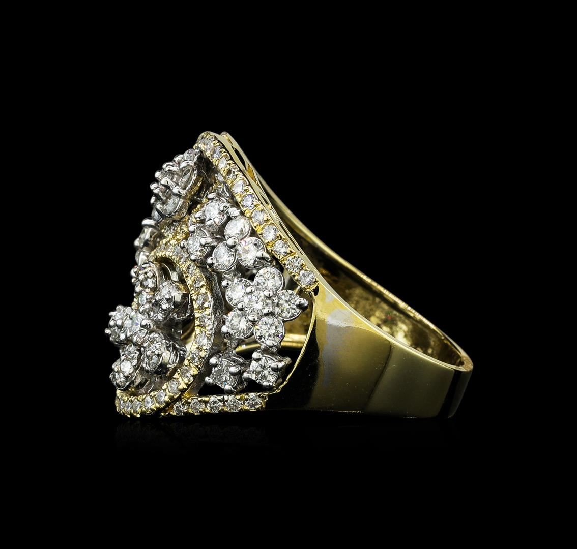 One electronically tested 14KT yellow and white gold lady's combination cast & assembled fashion ring with a wide band tapered shank with a bright polish finish. The featured ladies ring has a shank measuring 3.45 millimeters in width. Identified with markings of 'K14'. Condition is new, good workmanship. Containing: Thirty-Seven prong set round brilliant cut diamonds, measuring 1.90 - 1.80 x 1.13mm (depth est.) approximate total weight of 37 Stones = 0.88ct. Graded in the setting. Clarity SI-1 to I-1. Color: G - H Cut Good Twenty-Eight prong set round brilliant cut diamonds, measuring 1.40 - 1.30 x 0.82mm (depth est.) approximate total weight of 28 Stones = 0.24ct. Graded in the setting. Clarity SI-1 to I-1. Color: H - I Cut Good Ninety-Two prong set round brilliant cut diamonds, measuring 1.20 - 1.10 x 0.70mm (depth est.) approximate total weight of 92 Stones = 0.58ct. Graded in the setting. Clarity SI-1 to I-1. Color: H - I Cut Good. Total Weight of Diamonds 1.70ct.. Total Weight of Ring 7.60gm GAS Appraised at $6,215.00.