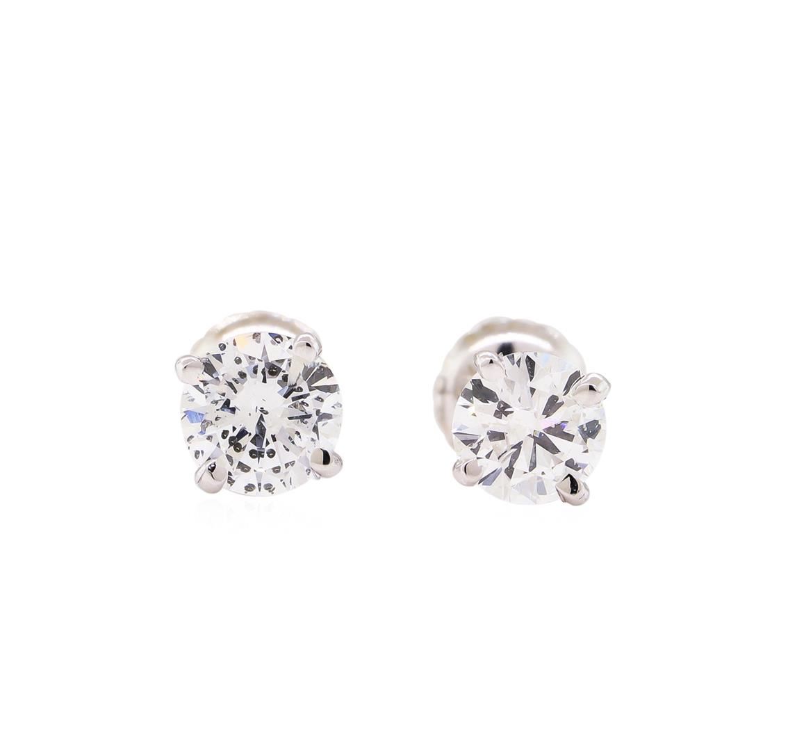 One pair electronically tested 14KT white gold lady's combination cast & assembled stud earrings with threaded posts and screw-on/screw-off backs with a bright polish finish. Identified with markings of "14K". Condition is new, good workmanship. Containing: Two prong set round brilliant cut diamonds, measuring 5.49 - 5.15 x 3.33mm (depth est.) approximate total weight of 2 Stones = 1.12ct. Graded in the setting. Clarity: SI-2 to I-1. Color: G - Good. Total Weight of Diamonds 1.12ct. Total Weight of Earrings 1.00gm. GAS Appraised at $5,900.00.