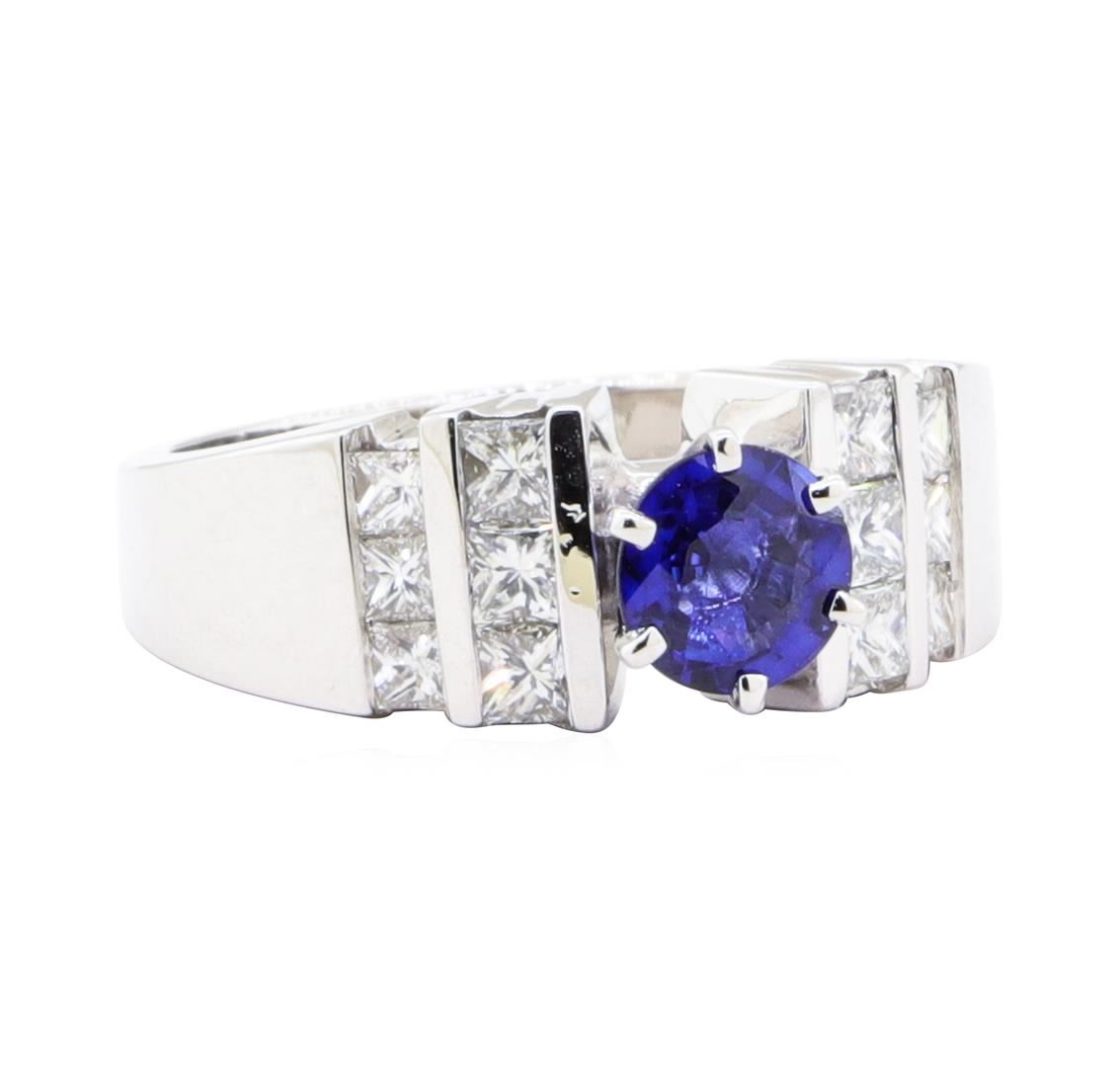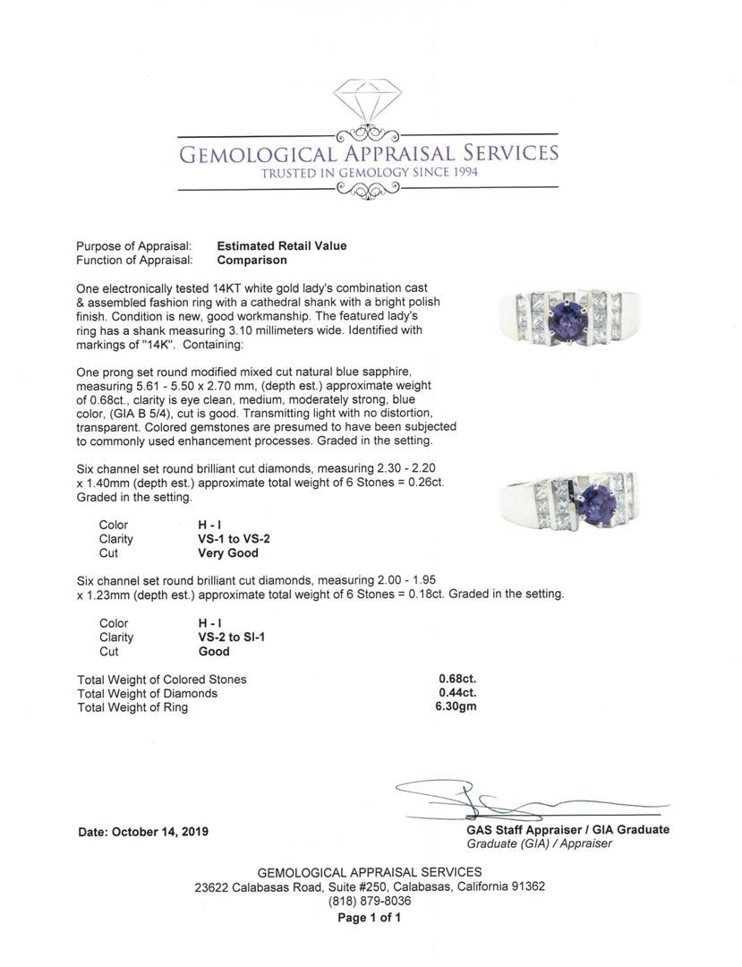 One electronically tested 14KT white gold lady's combination cast & assembled fashion ring with a cathedral shank with a bright polish finish. The featured lady's ring has a shank measuring 3.10 millimeters wide. Identified with markings of '14K'. Condition is new, good workmanship. Containing: One prong set round modified mixed cut natural blue sapphire, measuring 5.61 - 5.50 x 2.70 mm, (depth est.) approximate weight of 0.68ct., clarity is eye clean, medium, moderately strong, blue color, (GIA B 5/4), cut is good. Transmitting light with no distortion, transparent. Colored gemstones are presumed to have been subjected to commonly used enhancement processes. Graded in the setting. Six channel set round brilliant cut diamonds, measuring 2.30 - 2.20 x 1.40mm (depth est.) approximate total weight of 6 Stones = 0.26ct. Graded in the setting. Color H - I Clarity VS-1 to VS-2 Cut Very Good Six channel set round brilliant cut diamonds, measuring 2.00 - 1.95 x 1.23mm (depth est.) approximate total weight of 6 Stones = 0.18ct. Graded in the setting. Color H - I Clarity VS-2 to SI-1 Cut Good. Total Weight of Colored Stones 0.68ct.. Total Weight of Diamonds 0.44ct.. Total Weight of Ring 6.30gm GAS Appraised at $2905.00. GAS Appraised.