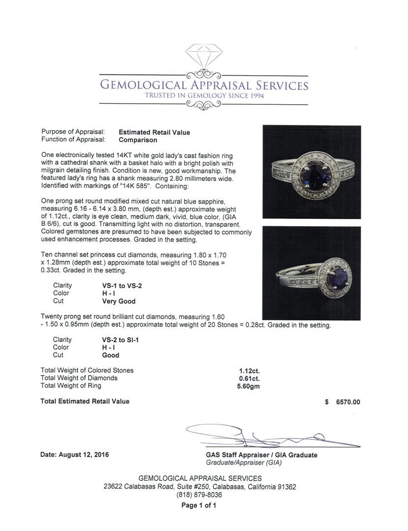 One electronically tested 14KT white gold lady's cast fashion ring with a cathedral shank with a basket halo with a bright polish with milgrain detailing finish. The featured lady's ring has a shank measuring 2.80 millimeters wide. Identified with markings of '14K 585'. Condition is new, good workmanship. Containing: One prong set round modified mixed cut natural blue sapphire, measuring 6.16 - 6.14 x 3.80 mm, (depth est.) approximate weight of 1.12ct., clarity is eye clean, medium dark, vivid, blue color, (GIA B 6/6), cut is good. Transmitting light with no distortion, transparent. Colored gemstones are presumed to have been subjected to commonly used enhancement processes. Graded in the setting. Ten channel set princess cut diamonds, measuring 1.80 x 1.70 x 1.28mm (depth est.) approximate total weight of 10 Stones = 0.33ct. Graded in the setting. Clarity VS-1 to VS-2. Color: H - I Cut Very Good Twenty prong set round brilliant cut diamonds, measuring 1.60 - 1.50 x 0.95mm (depth est.) approximate total weight of 20 Stones = 0.28ct. Graded in the setting. Clarity VS-2 to SI-1. Color: H - I Cut Good. Total Weight of Colored Stones 1.12ct.. Total Weight of Diamonds 0.61ct.. Total Weight of Ring 5.60gm. GAS Appraised at $6,570.00.