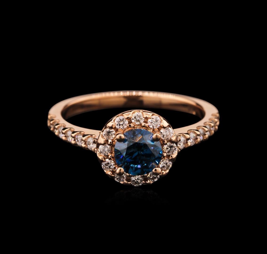 One ring featuring: 14KT rose gold weighing 3.08 grams containing one blue diamond center stone with a total weight of 0.75ct and 24 white side diamonds with a total weight of 0.37ct.