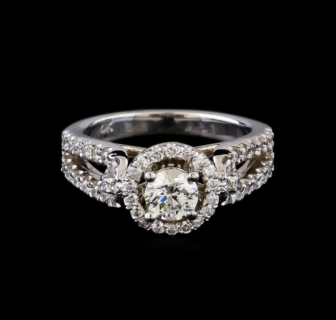 One electronically tested 14KT white gold lady's cast wedding ring with a split shank basket halo with a bright polish finish. The featured lady's ring has a shank measuring 2.55 millimeters in width. Identified with markings of "14K". Condition is new, good workmanship. Containing: One prong set round brilliant cut diamond, measuring 5.24 - 5.22 x 3.45mm (depth est.) , 3.00.%. GTCF approximate weight of 0.60ct. Graded in the setting. Clarity: I-1. Color: F. Cut Very Good Fifty-Four prong set round brilliant cut diamonds, measuring 1.40 - 1.35 x 0.86mm (depth est.) approximate total weight of 54 Stones = 0.53ct. Graded in the setting. Clarity: VS-2 to SI-2. Color: G - I. Cut Good. Total Weight of Diamonds 1.13ct. Total Weight of Ring 6.10gm. GAS Appraised at $6,490.00.