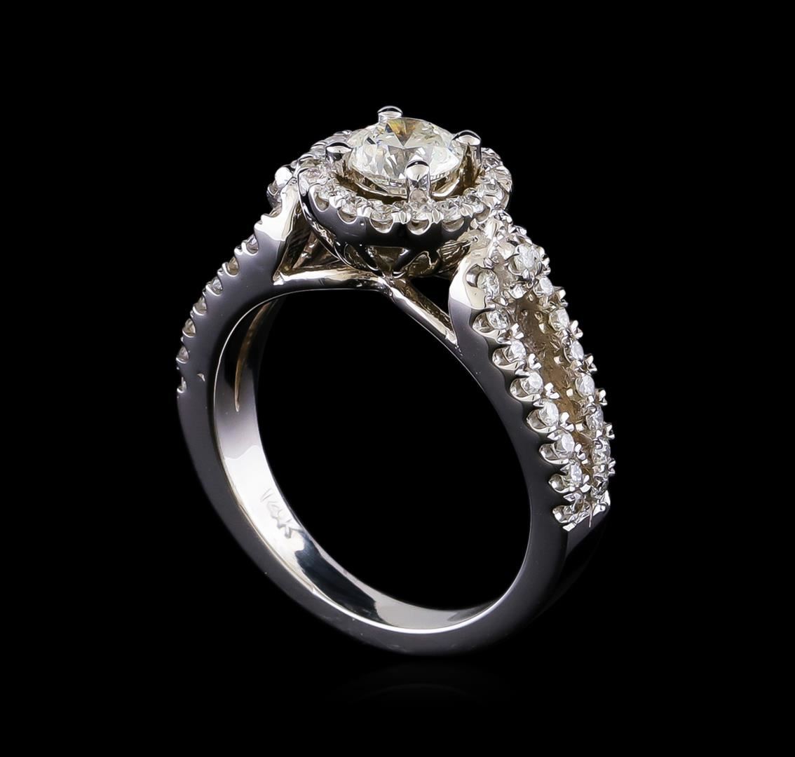 One electronically tested 14KT white gold lady's cast wedding ring with a split shank basket halo with a bright polish finish. The featured lady's ring has a shank measuring 2.55 millimeters in width. Identified with markings of "14K". Condition is new, good workmanship. Containing: One prong set round brilliant cut diamond, measuring 5.24 - 5.22 x 3.45mm (depth est.) , 3.00.%. GTCF approximate weight of 0.60ct. Graded in the setting. Clarity: I-1. Color: F. Cut Very Good Fifty-Four prong set round brilliant cut diamonds, measuring 1.40 - 1.35 x 0.86mm (depth est.) approximate total weight of 54 Stones = 0.53ct. Graded in the setting. Clarity: VS-2 to SI-2. Color: G - I. Cut Good. Total Weight of Diamonds 1.13ct. Total Weight of Ring 6.10gm. GAS Appraised at $6,490.00.